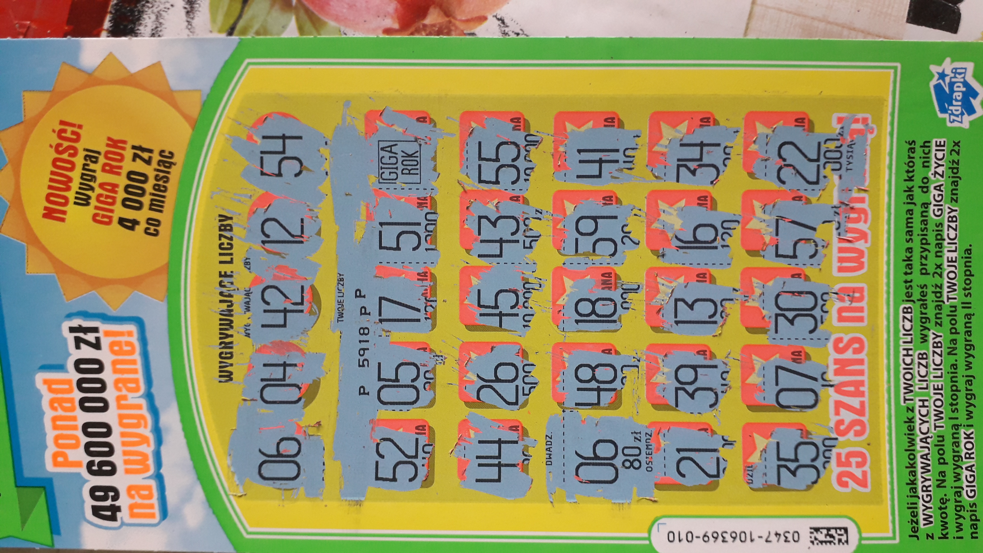 Zaszedłem po pracy i od razu zaatakowałem.Niestety z takim skutkiem,że zostały ostatnie 3 zdrapki z numerami 005,007,011 i w numerze 005 było 40zł.Za całość wziąłem już te dwie ostatnie bo i tak wyjścia nie było a co lepsze załozyłem się z kolektorką o zdrapkę za 1zł,że będzie jeszcze 2x40 no i przegrałem