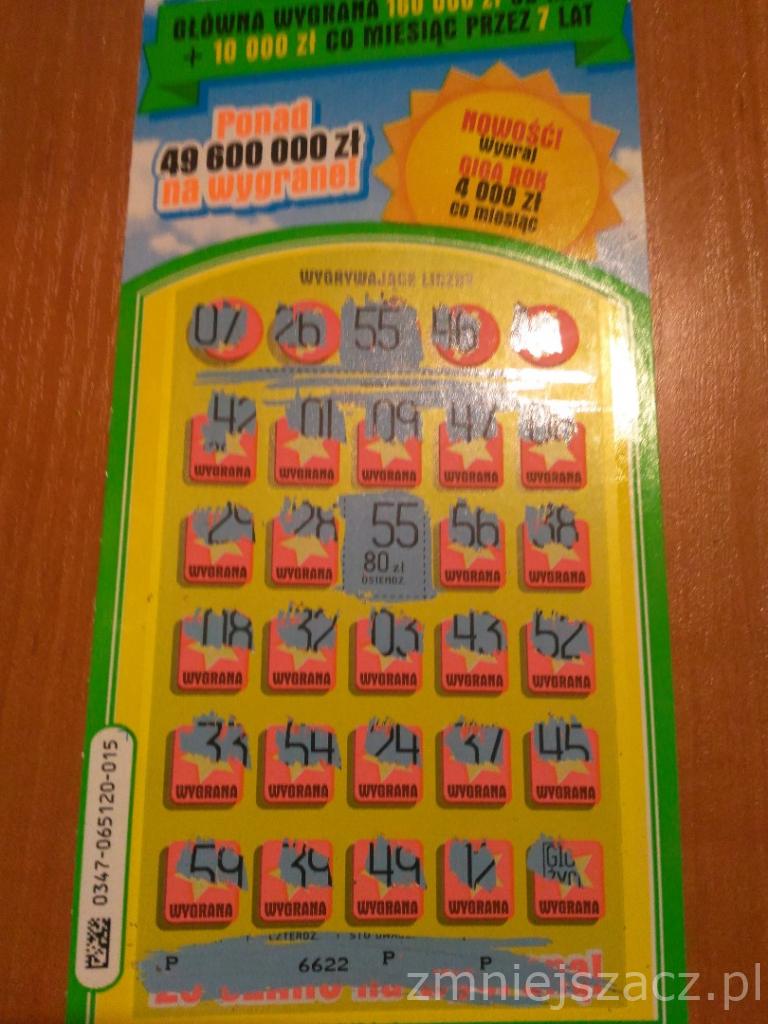 - 4 x20 zł plus 80 zł i minimalny zwrot 160 zł przy 5 pełnych zdrapkach