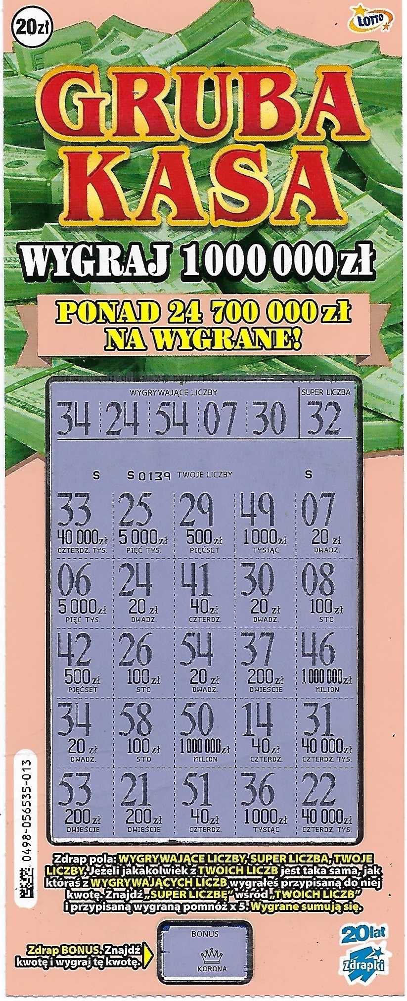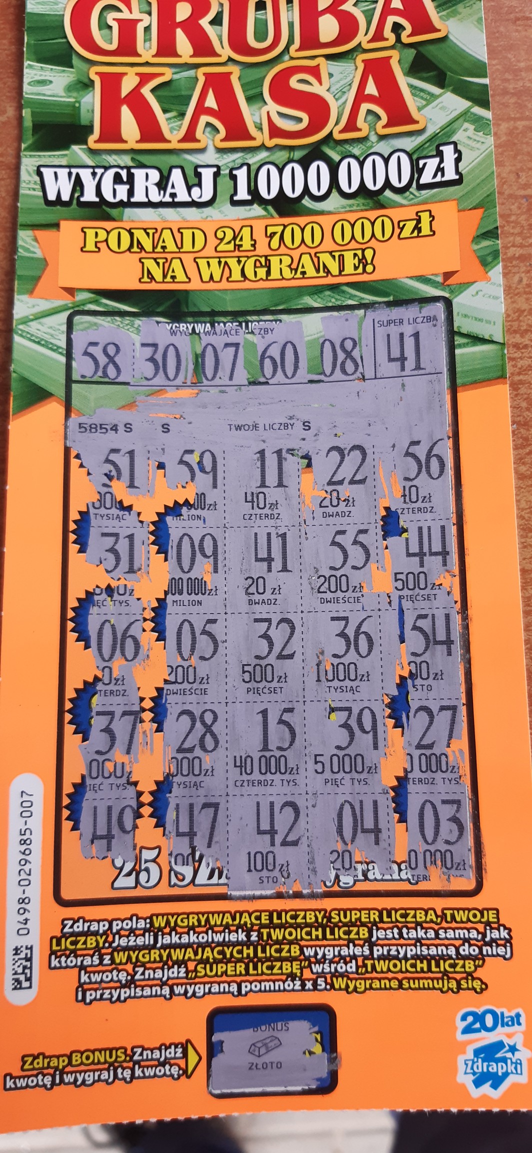 Wymieniając wieczorem wygrane zdrapki wzięłam jedną Grubą Kasę, nr 001, w którym trafiłam 40 zł.