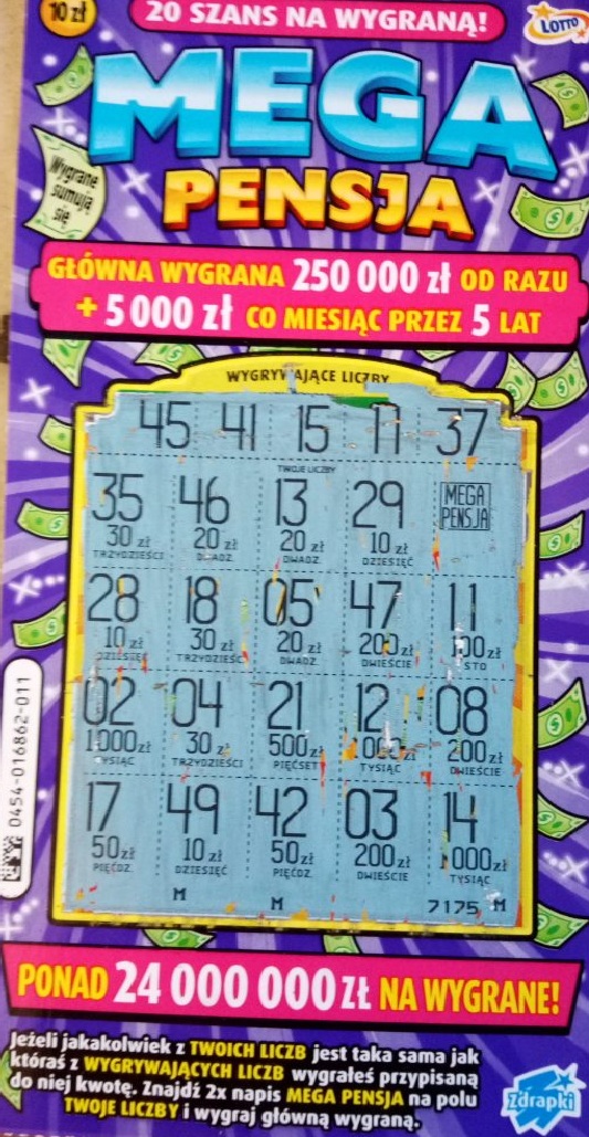 Z racji okropnej warstwy ścieralnej, Mega Pensję kupuję tylko czasem ale dziś skusiłem się na 1 sztukę z numerem 020 i wpadło pierwszy raz od dłuższego czasu 50 zł (rozbite na 10+20+20)