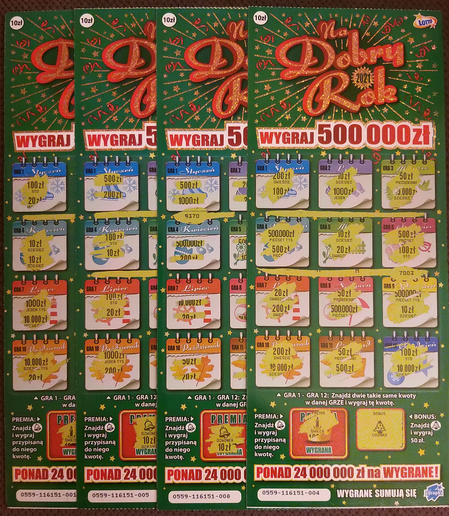 Jesteś w stanie podać numerki tych trafionych zdrapek, tak z ciekawości bo ja kupiłem te 9 sztuk od nr 001 do 009 i trafione 001-10, 004-10, 005-10 i 008- Choinka za 50, czyli albo w reszcie wykupionych z paczki bylo jeszcze tylko 2 pełne po 20 chyba że była też losowa hmm