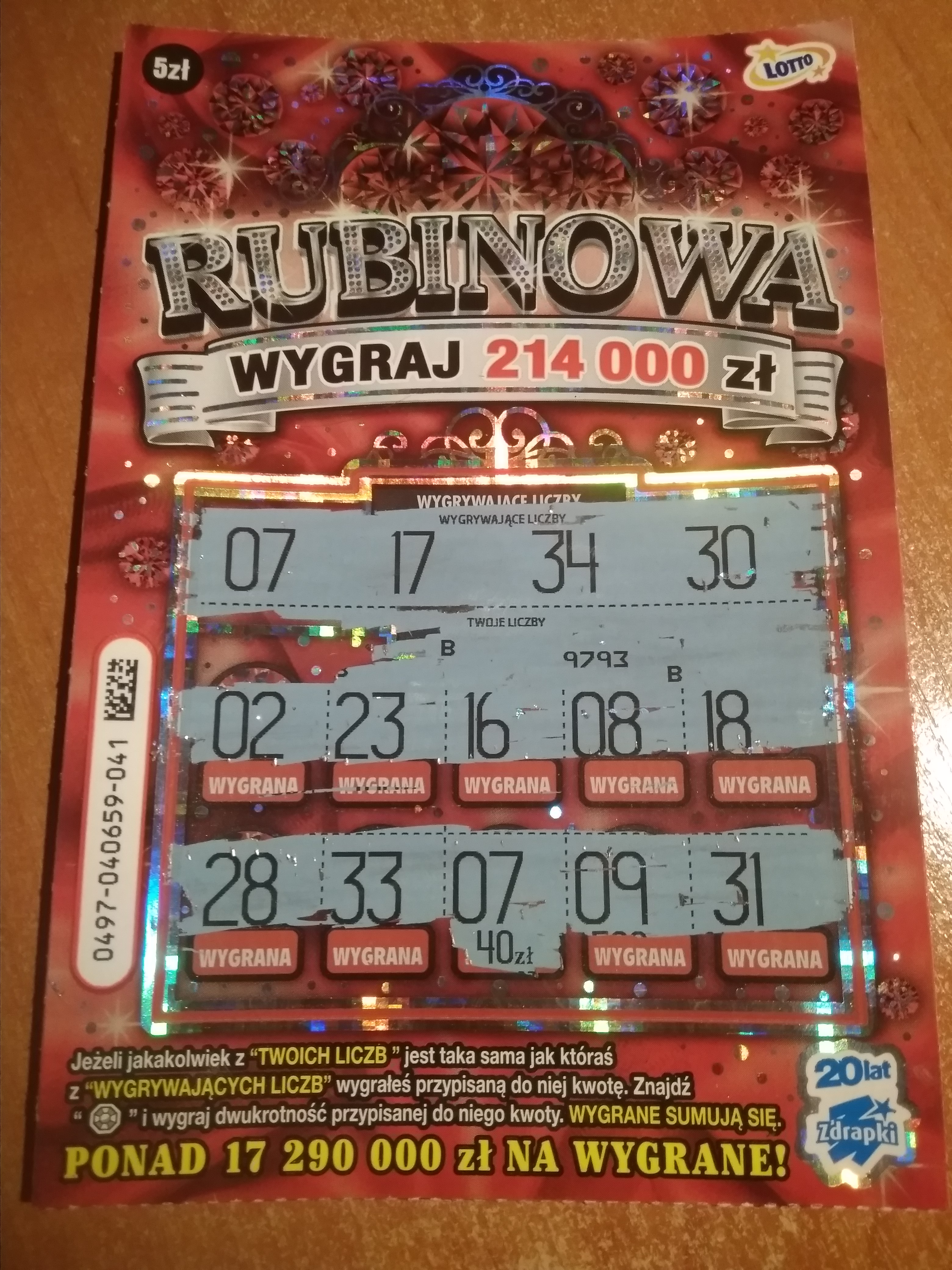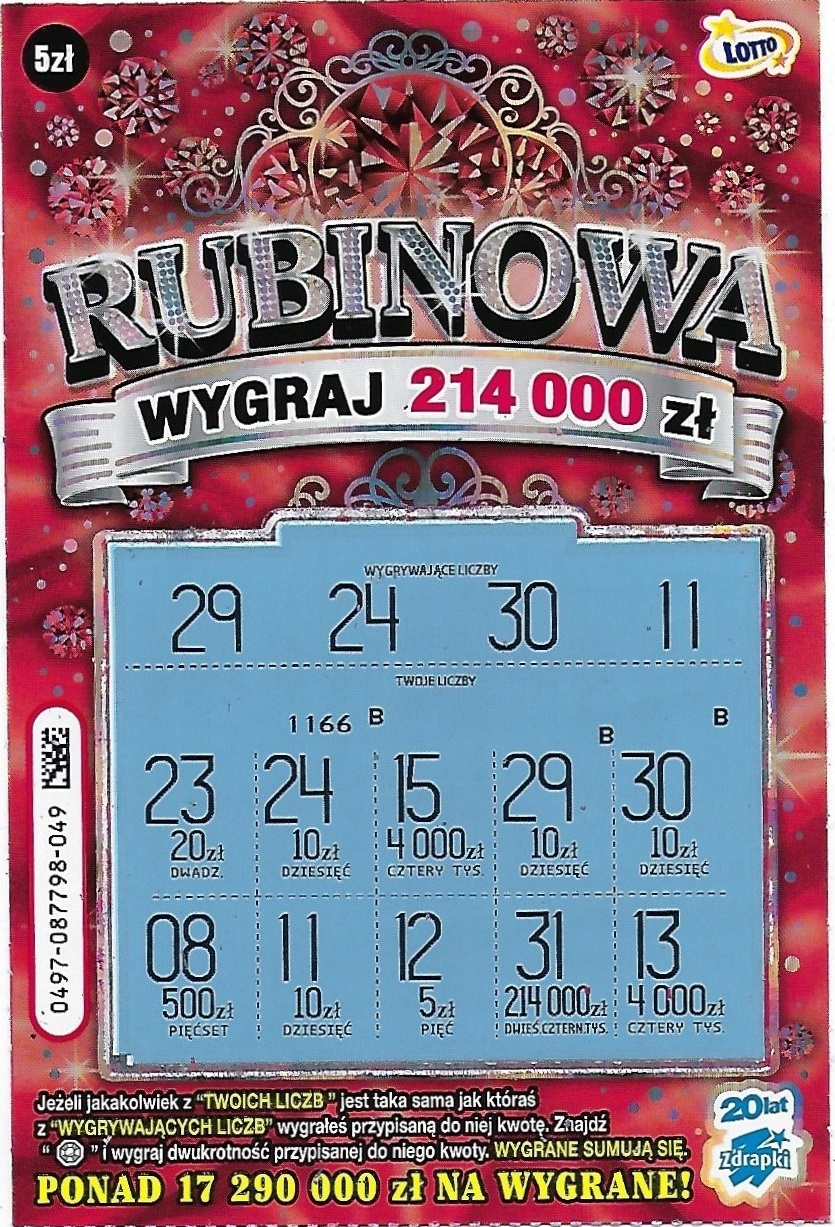 Wieczorem wymieniając zdrapki w innym miejscu wybrałam numer 001, w którym było 20 zł, 032 w którym było 10 zł oraz 049 pusty.
