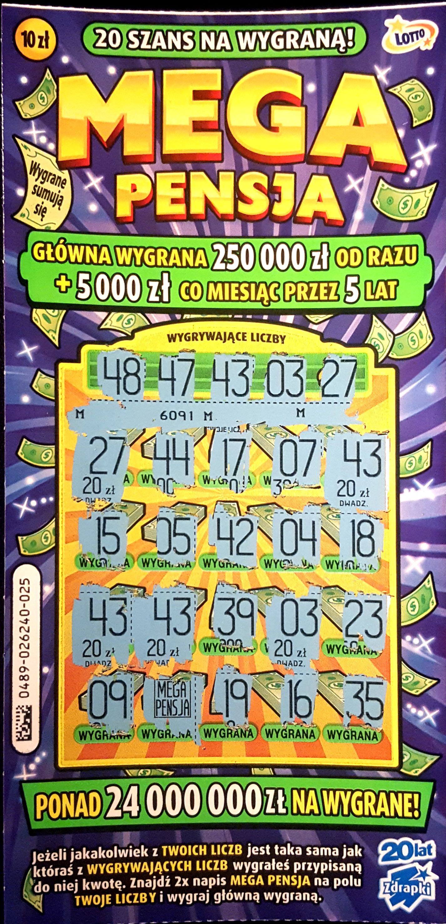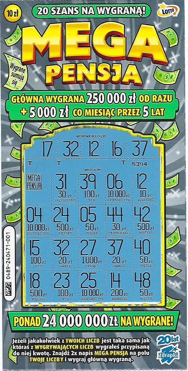 Pierwsze 4 numery z początku całego "kodu" 0489 to jest numer gry liczbowej, czyli każda Mega Pensja będzie miała taki sam, kolejny ten dłuższy numer ten w środku to numer przedziału/paczki (w 1 paczce jest określona liczba zdrapek nie wiem ile dokładnie jest w Mega Pensji 25 30?), a 3 ostatnie cyfry to indywidualny numer zdrapki. Także możesz pójść do innej kolektury i będziesz miał np znowu 004 zdrapke ale z innym numerem tym dłuższym środkowym, bo będzie ona po prostu z innej paczki. Aczkolwiek nie masz gwarancji, że znów w tym numerze będziesz miał jakąś wygrana, ponieważ to jest loteria. Czasami faktycznie niektóre numery są bardziej szczęśliwe i jest większe prawdopodobieństwo że w danym numerze coś będzie, ale gwarancji nie masz