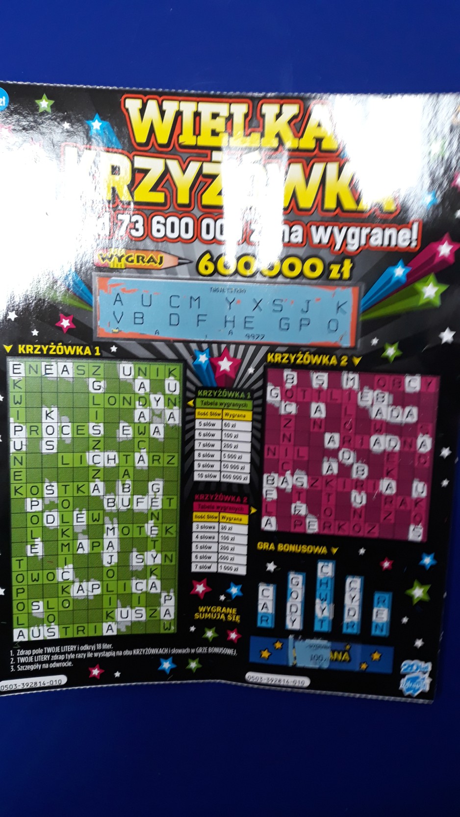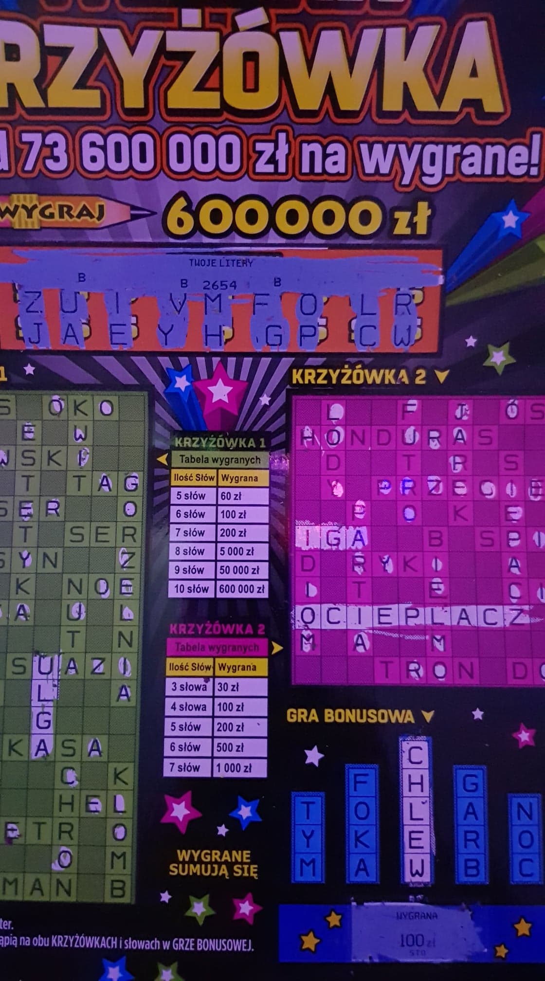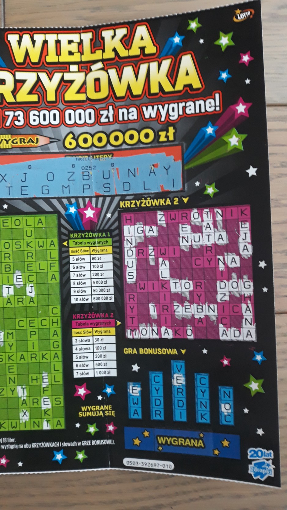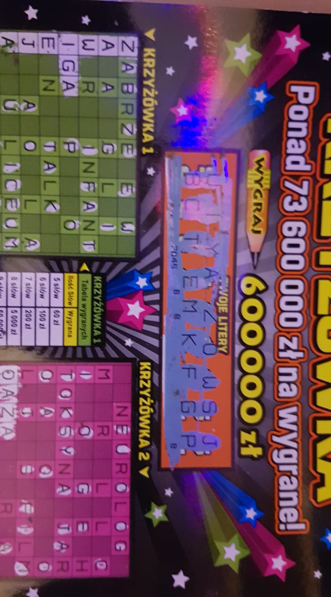 Wzięlam Wielką Krzyżówkę bo otworzyli paczkę. Po numerach ostatnio mi nie szło więc zaczęłam czytać słowa i jak zobaczyłam SZTUCER I FURIA to pomyślałam, że świetnie obrazują moje uczucia wobec tych, którzy rozdzielają wygrane w zdrapkach. Wzięłam i jak wydrapałam 5 słów w pierwszej krzyżówce to z zachwytu nad wygraną stówą przestałam szukać. Dałam pani do sprawdzenia a ona mówi, że są dwie stówki i pozwoliła mi dodrapać. W ferworze wydrapałam nawet wiecej słów niż 7 ale to fake. Jest tylko 7 i za to 200 zł.