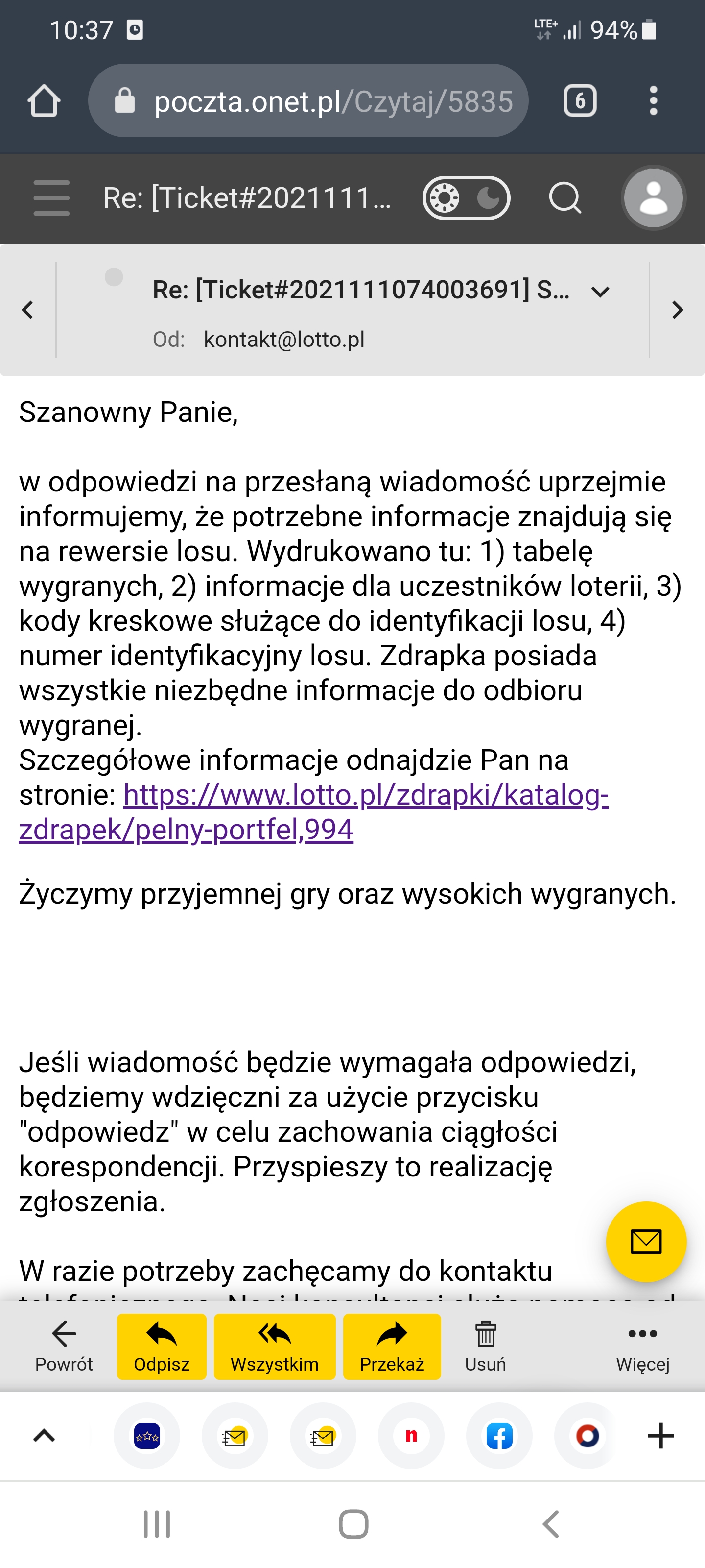oni mnie mają za idiotę chyba...pisze im wyraźnie że zdrapka źle zeskanowana bo brakuje jej nr itp czy te maile czyta człowiek czy tępy robot. Chyba zadzwonie na infolinie. Nie odpuszcze baranom