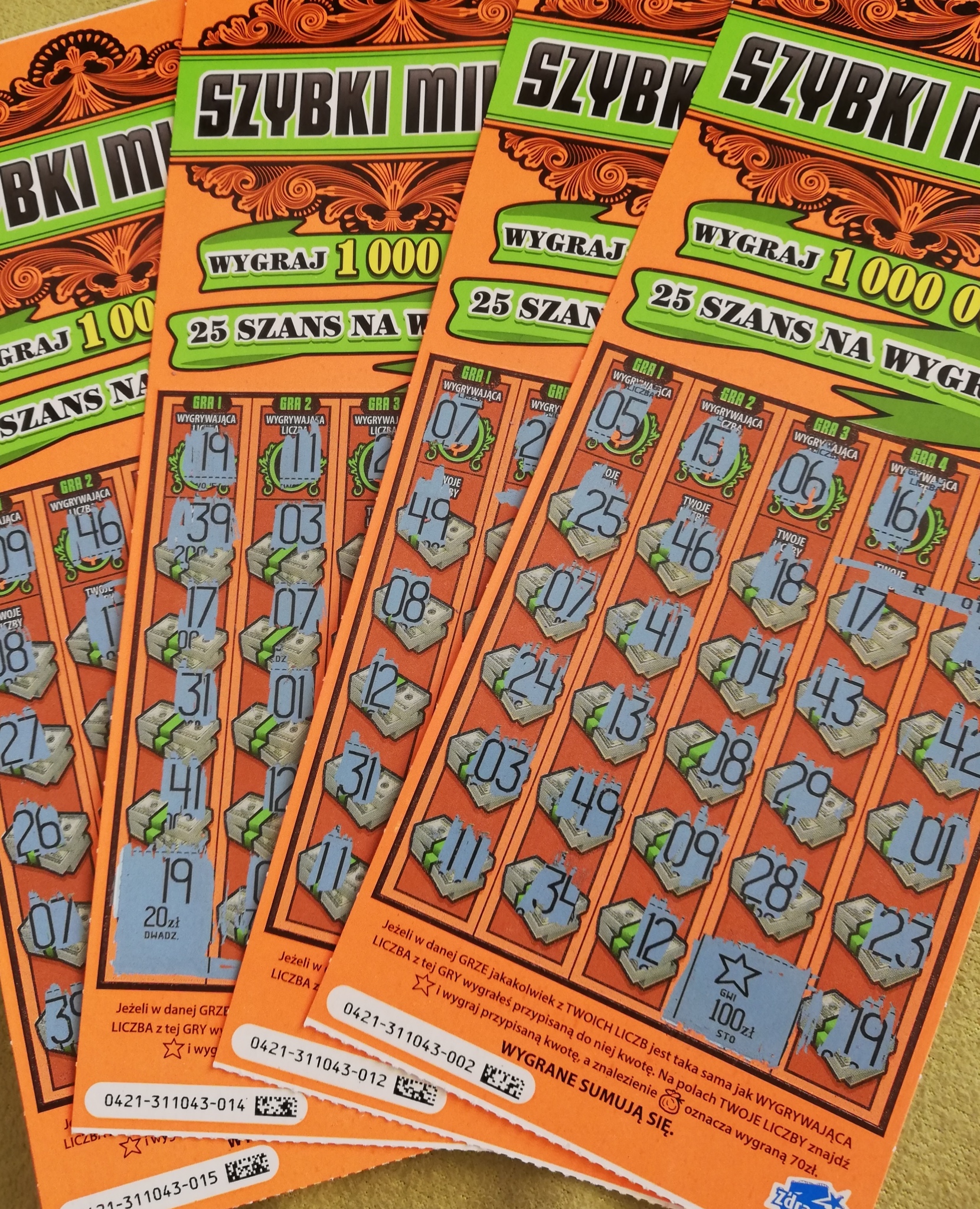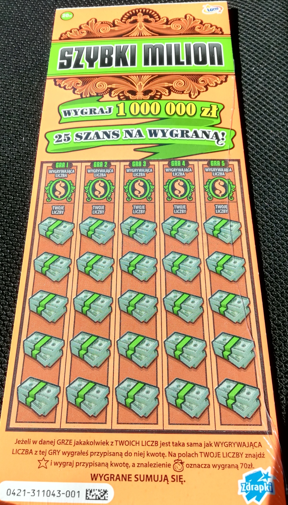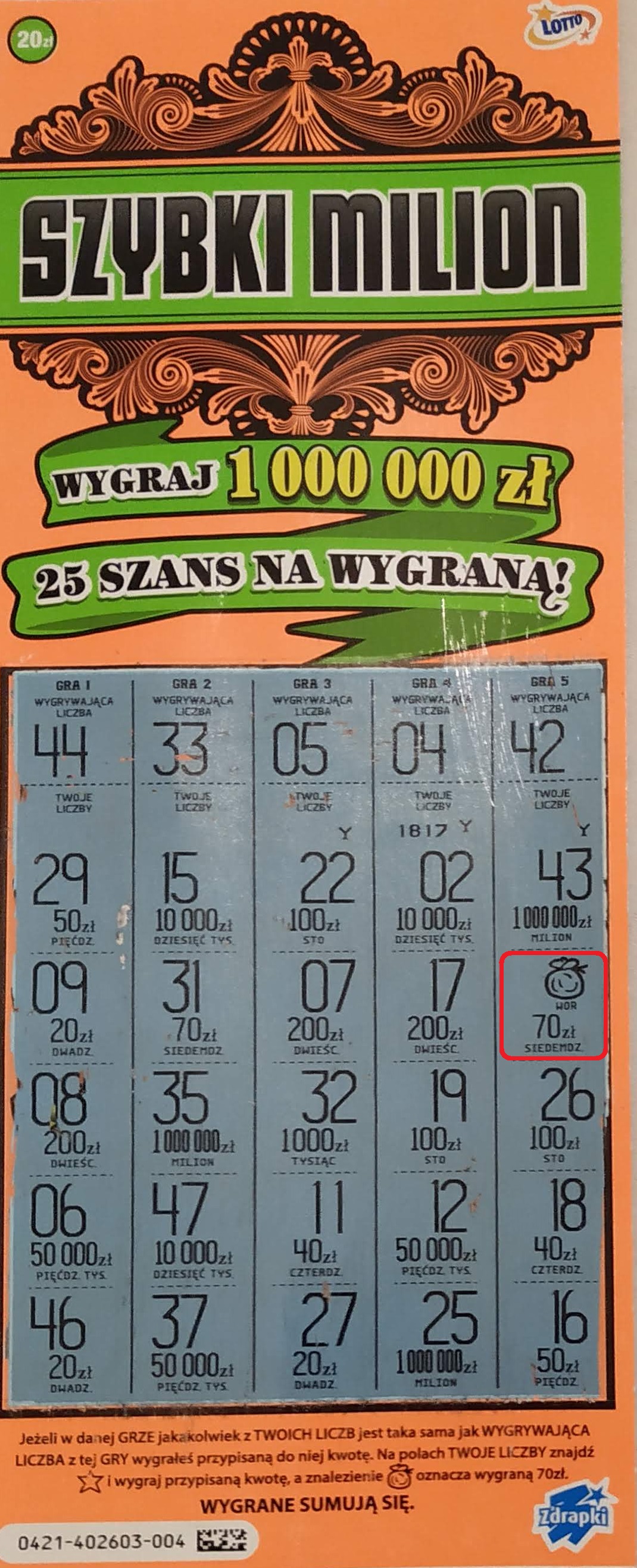 wczoraj kupiona z numer 003 wpadło 40 zł dziś numer 13 i 20 zł