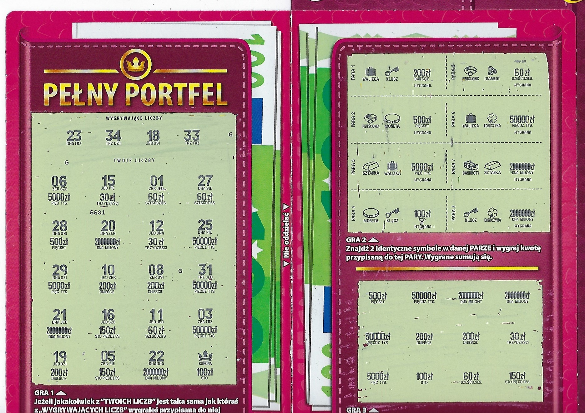 dwie sztuki zdrapane, w nr 001 30 zł a w nr 024 trafione 100 zł pod symbolem korony