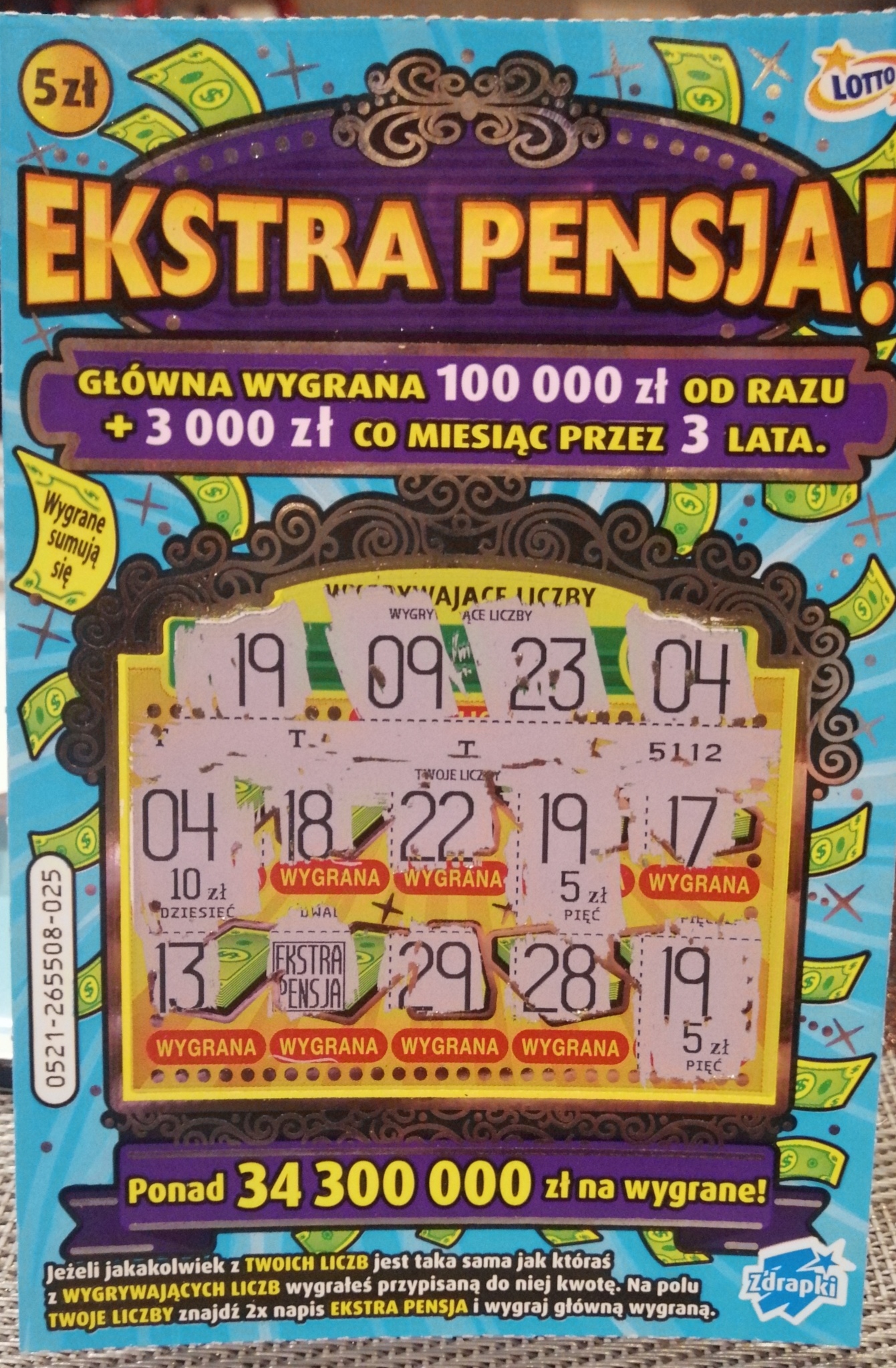 Mama wzięła dla odmiany Ekstra Pensję i trafiła 50zł (nr 23), wymieniła na jeszcze dwie sztuki - z tej samej kolektury było jeszcze 5zł, a z innej 20zł też w numerze 23.