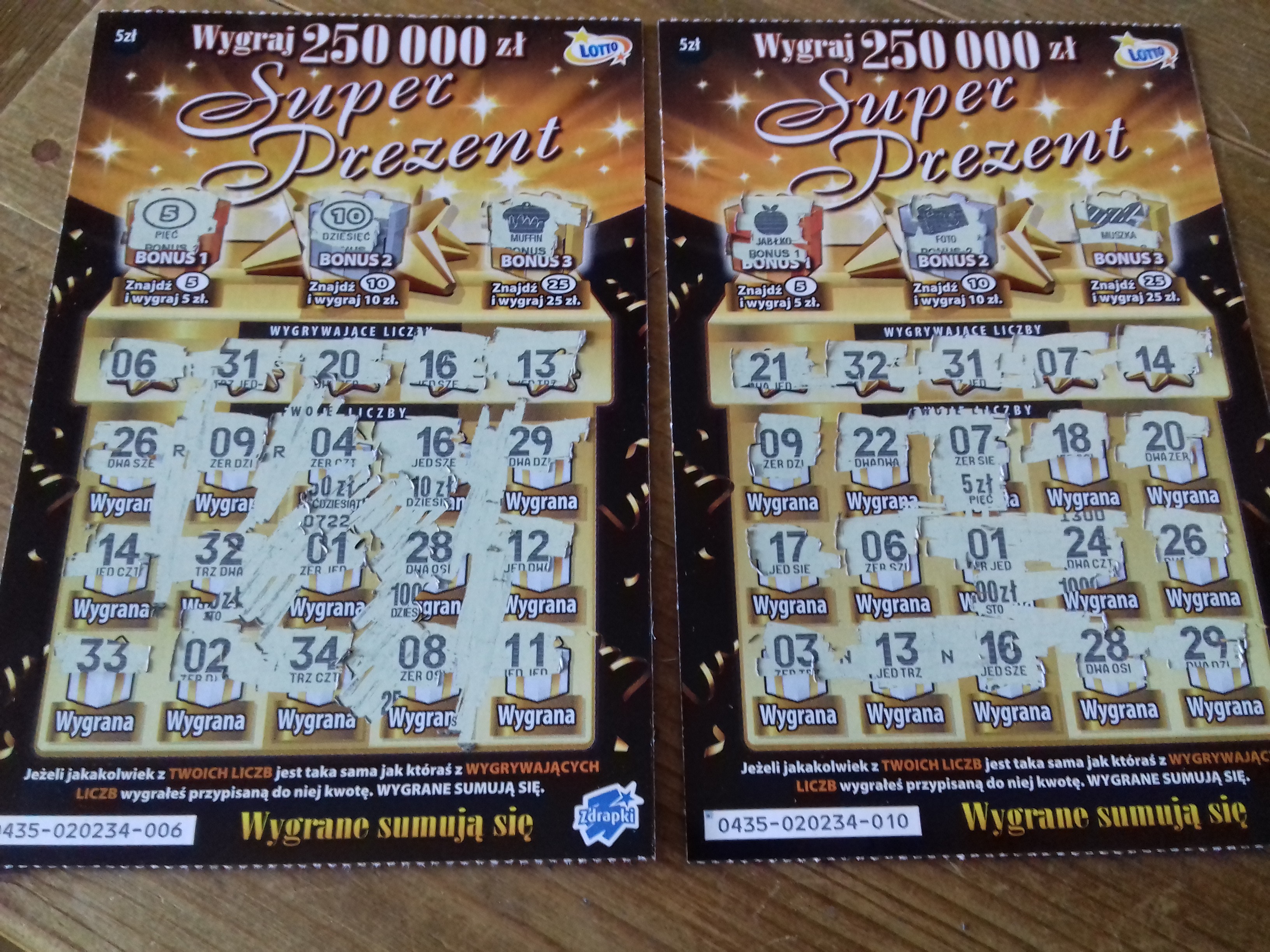 W ciągu 2-3 ostatnich tygodni byłem chyba w 30 punktach gdzie są zdrapki, w kilku był SP a le numery powyżej 400tyś. Dzisiaj udało mi się dorwać jedną jedyną w Chorzowie z numerami 020234