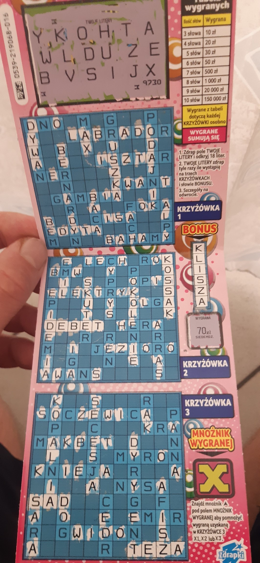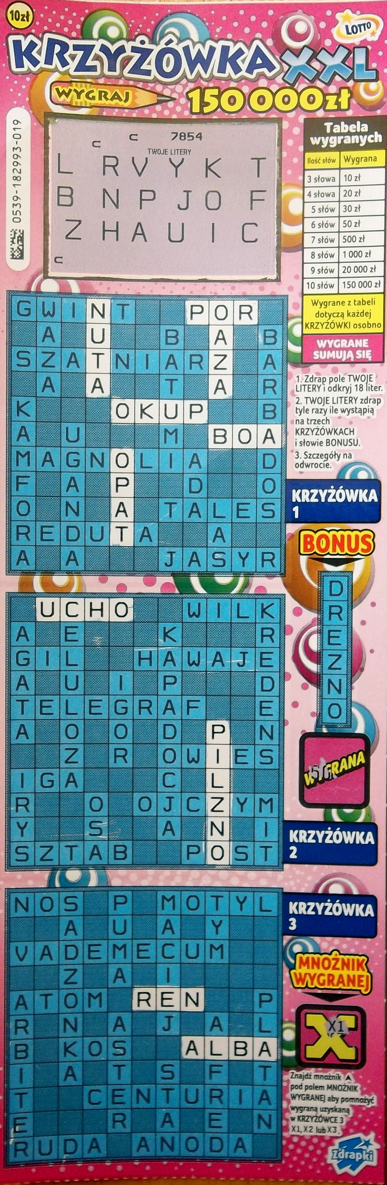 Wygrane w Różowym złocie 20 zł wymieniłam na linie i krzyżówkę po 10 zł. Linia nr 1 pusta, KrzyżówkaXXL nr 23 dała 30 zł. Ale sama się zdziwiłam bo pierwsze zdrapane literki to F,V,X.