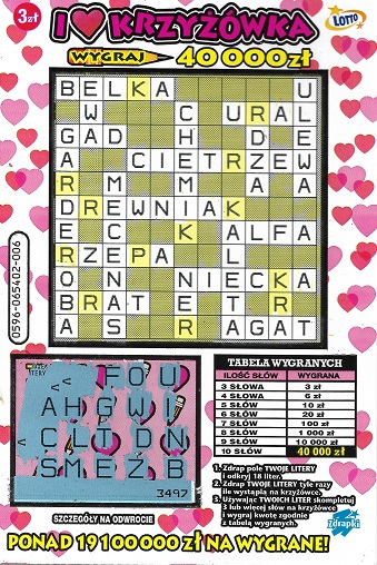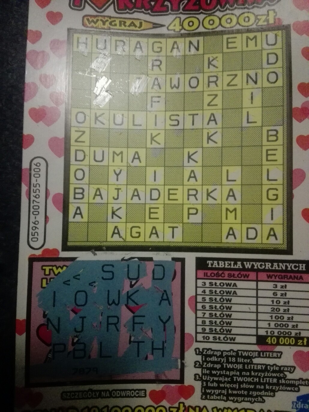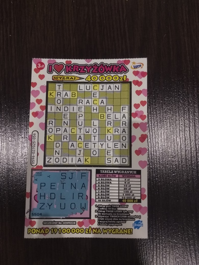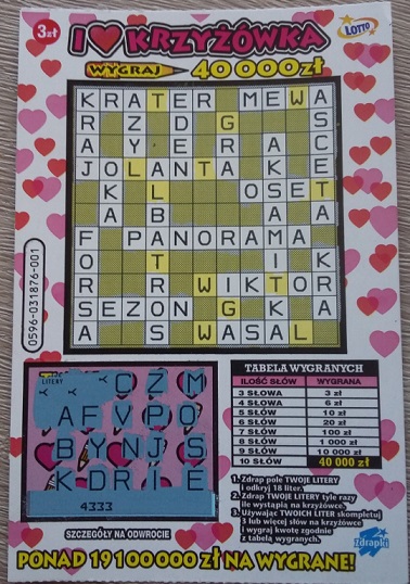 Taki zaszczyt mnie dzisiaj spotkał w krzyżówce, wydrapałem 7 słów = 100zł. A krzyżówkę kupiłem tylko jedną sztukę i co ciekawe nr 001 :)