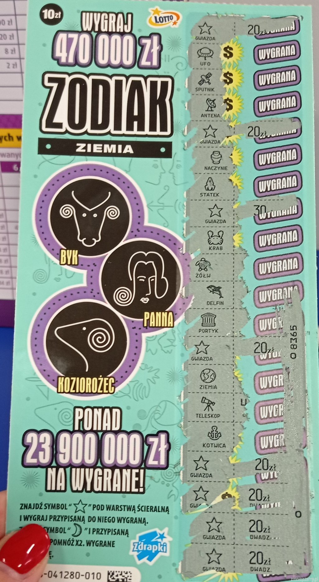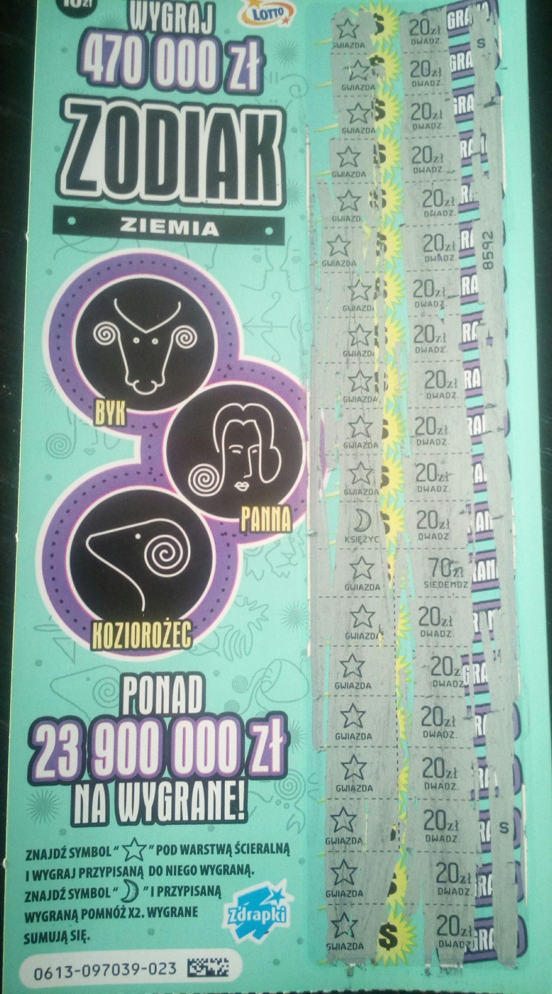 Dzisiaj po raz kolejny kupiłem Zodiaka (ogień) i po raz kolejny ta wersja losu była wygrana. Co prawda 10zł (012), ale na razie wszystkie ognie miałem z wygraną. Zobaczymy jak długo utrzymam passę