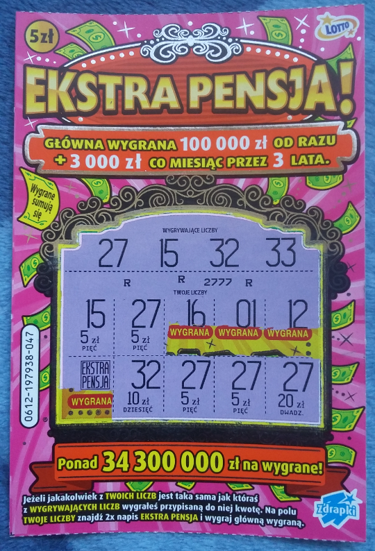 To kiepski wybór, że padło na Ekstra Pensję po 1,5 rocznym odwyku ;Pmarissaw007 pisze: ↑05 mar 2022, 20:07Po 1,5 roku przerwy od zdrapek, kupiłem dziś 4 ekstra pensje i wszystkie puste![]()
