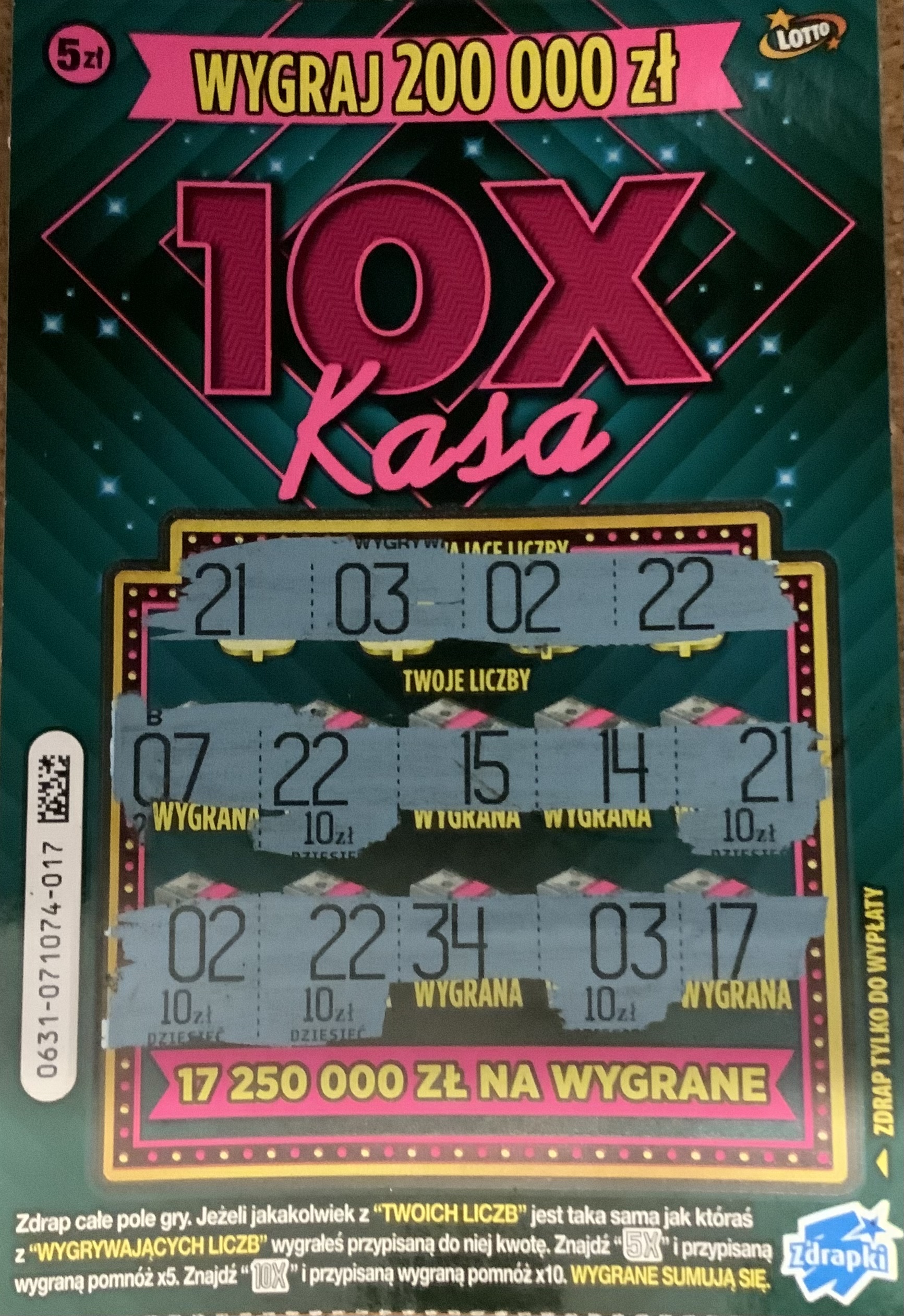 Jak dobrze zrozumiałem w kolekturze to w magazynach mojego oddziału już nie ma tej zdrapki, dodatkowo byłem dzisiaj w kilku punktach się rozejrzeć za innymi zdrapkami i przy okazji sprawdzałem też dostępność 10x kasa, w żadnym z odwiedzonych miejsc jej nie było