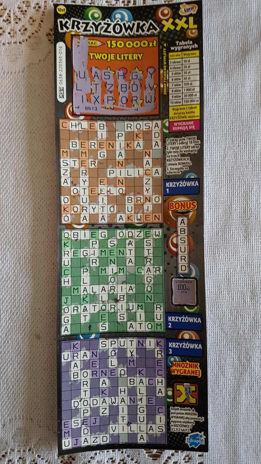 Poprosiłam męża żeby kupił mi jedną linię za 10zł. Oczywiście jak to on przyniósł mi inną zdrapkę bo krzyżówkę. Dzięki tej pomyłce wydrapałam z rana 100zł i to w bonusie.