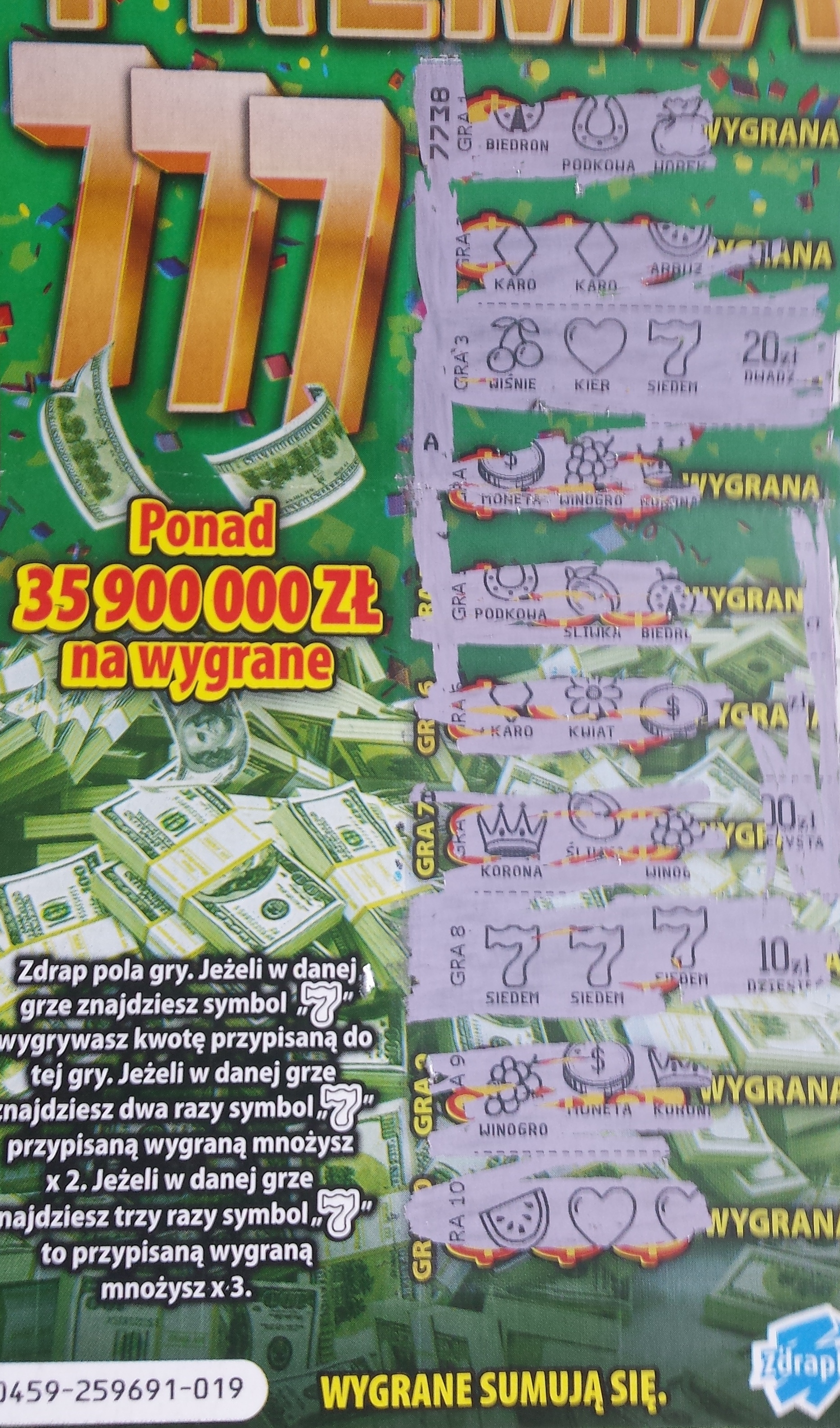 Ja tez więcej wygrywam biorąc po jednej zdrapce . Paczkę premii drapałam wynik 130 zł ...