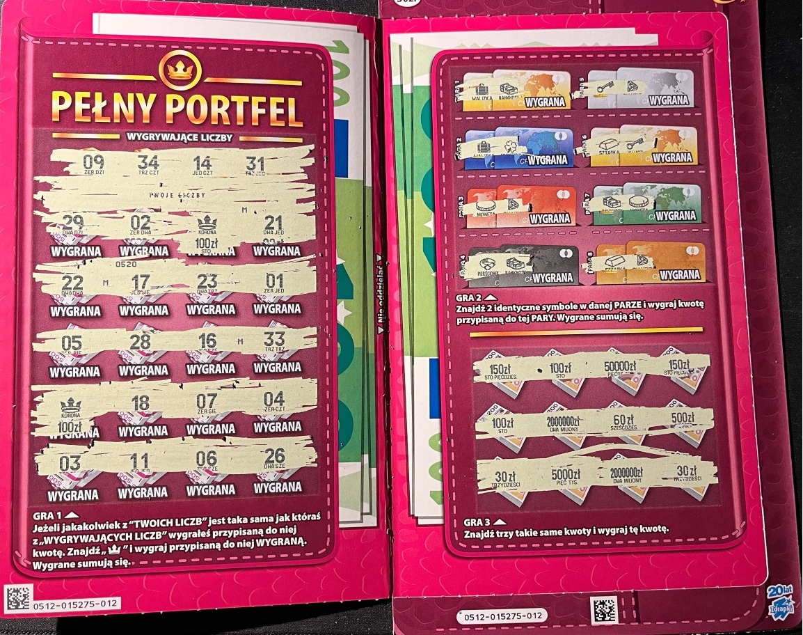 Tu masz rację, ja wziąłem wczoraj dwa Portfele bo mam przedział 005xxx ale jeden pustak a drugi 60 zeta więc jestem na zero, ale jakoś ta zdrapa mi nie podchodzi, skupiam się w 90% na szukaniu Krzyżówki XL i tych po 3 zeta, biorę też Koty jak są i Fast Cash, i Bonus 7 bo lubię więc zobaczymy co będzie.