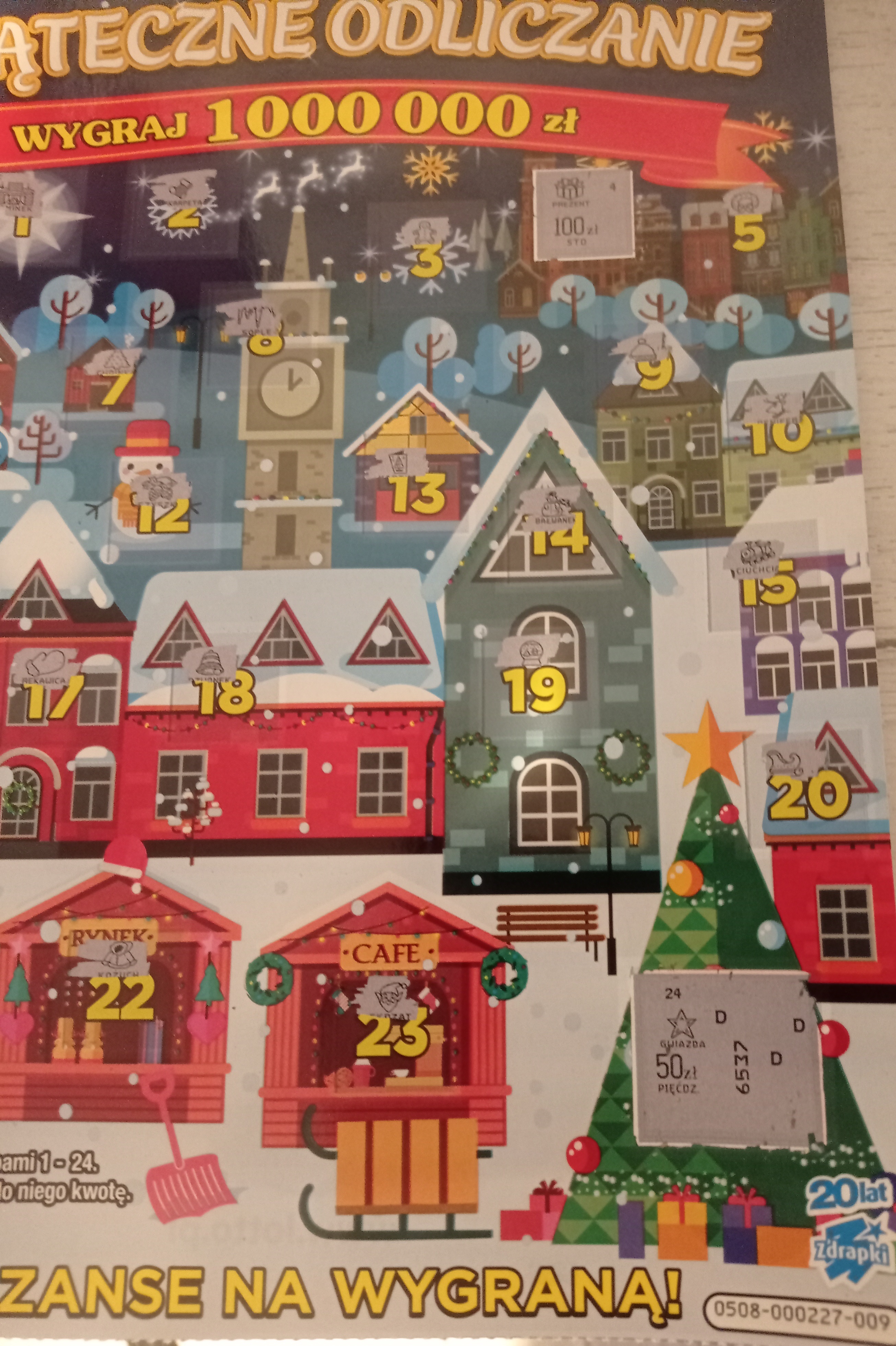 O rety, nie mogę wyjść z zaklętego kręgu dwusetek. Dziś do wieczornych zakupów wzięłam Świąteczne Odliczanie bo już nie ma co brać ze starych paczek a świątecznego bardzo bardzo bardzo dawno nie brałam. Pani mi podała jedną zdrapkę z dwóch, które miała. Numer 3 i 200 zł