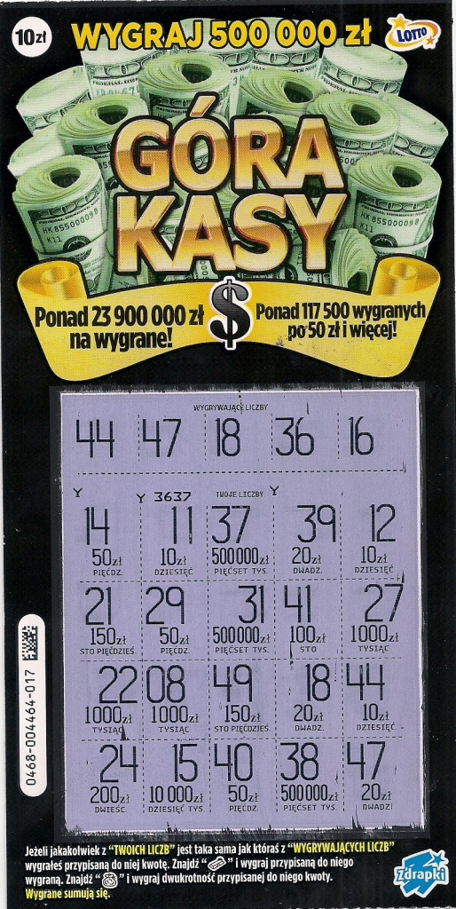Dzisiaj dokupilem 2sztk nr10, 14 i pustaki. Coś z tą zdrapka kombinują takiego początku nie pamiętam na tyle kupionych o zwrot ciężko.