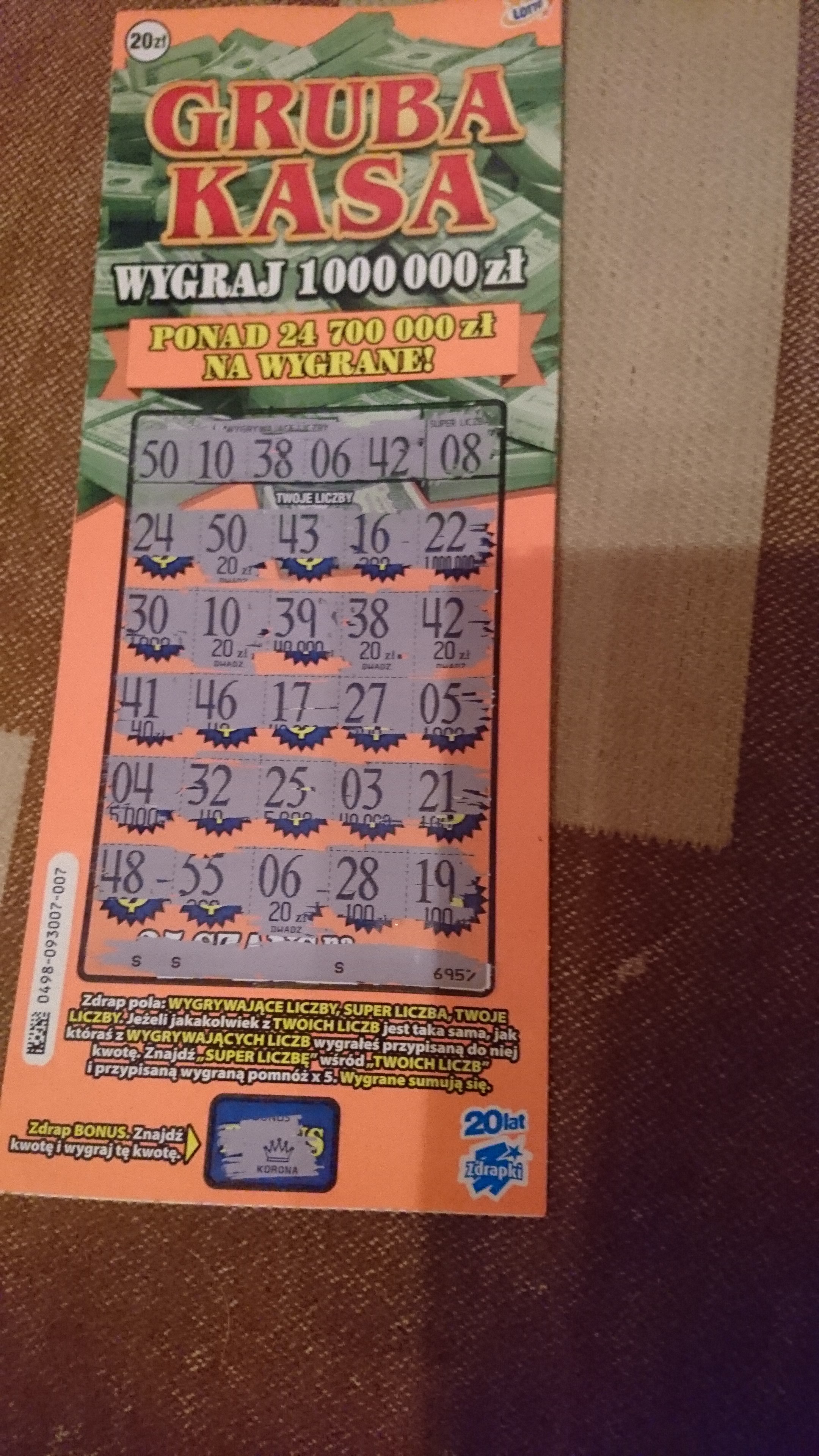 Mnie ta zdrapka nie lubi od wtorku kupione 10 sztuk i tylko raz w dniu premiery trafił się zwrot . Za to moja mama kupiła 2 sztuki i w obu po 100 zł