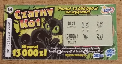 Kupiłam dzisiaj po 1 zdrapce czarny kot w dwóch różnych punktach i obydwie po 7 zł wygrane. W sumie razem 14 zł za wygraną kupiłam 1 zakład euro jackpot.