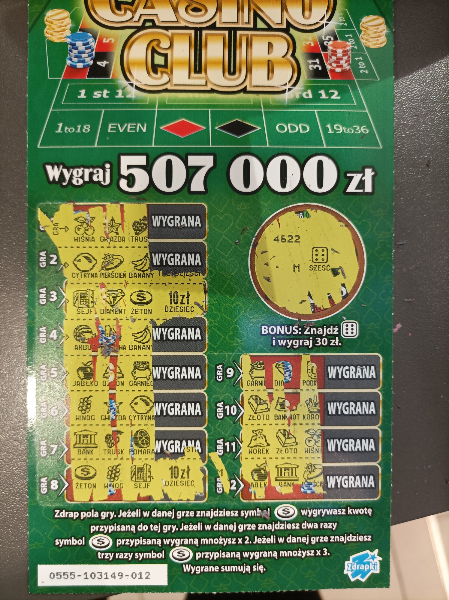 Czyli w tej zdrapce spokojnie można po literkach jechać, tu 3 różne to nie będzie wygranejMisiek1212 pisze: ↑09 maja 2022, 10:02Lepiej jest kupić np 50 zdrapek w jednym punkcie, i kolejne 50 w kolejnym. A nawet rozdzielić to po 25.