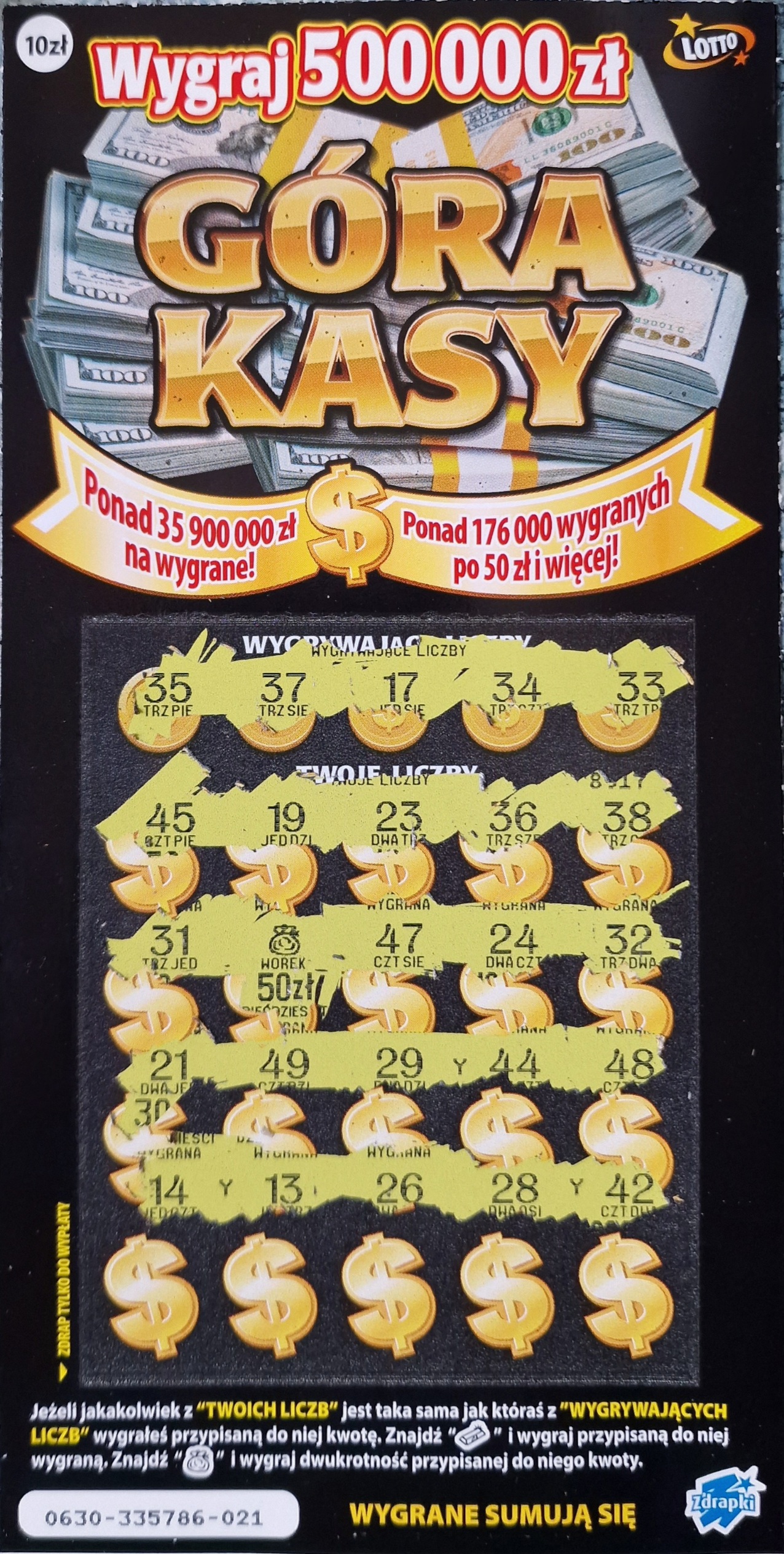 Druga sprawa że ta zdrapka góra kasy jest drukowana w najgorszej drukarni co łatwo dostrzec chociażby po żółtym tle na polu gry. Zdrapki z tej drukarni potrafią zaczynać nie od numeru 000001 tylko np. od 050000. Ponadto dodruk z tej drukarni potrafi sięgać nawet 20-30% wszystkich paczek co w przypadku tej zdrapki oznacza ich numeryczne wydłużenie o 50 czy 70 tysięcy. Fizycznie cały czas bedziesz miał 240000 ale numerycznie rozjeżdża się to totalnie...