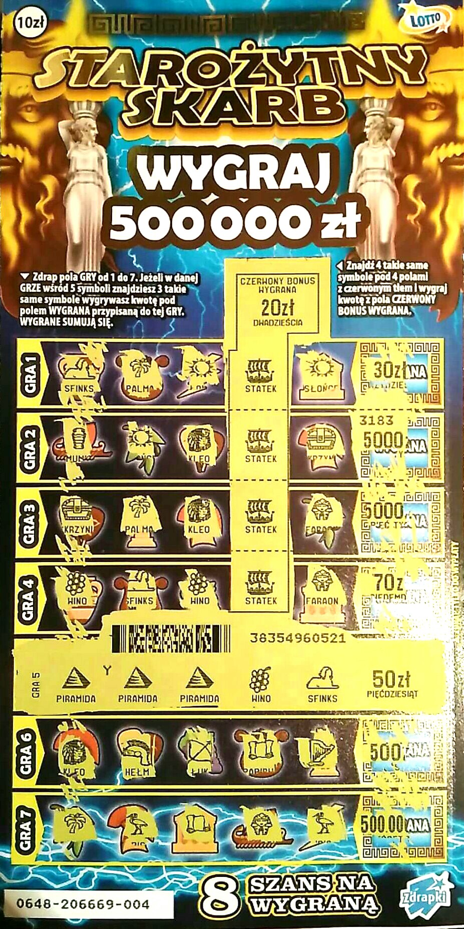 Polubiłem tę zdrapkę, dzisiaj 2 sztuki i obie wygrane 1x20 (014), 1x50 (022). Dotychczas trafiłem 1x70, 2x50, 2x30, 1x20, a 10zł ani razu :D