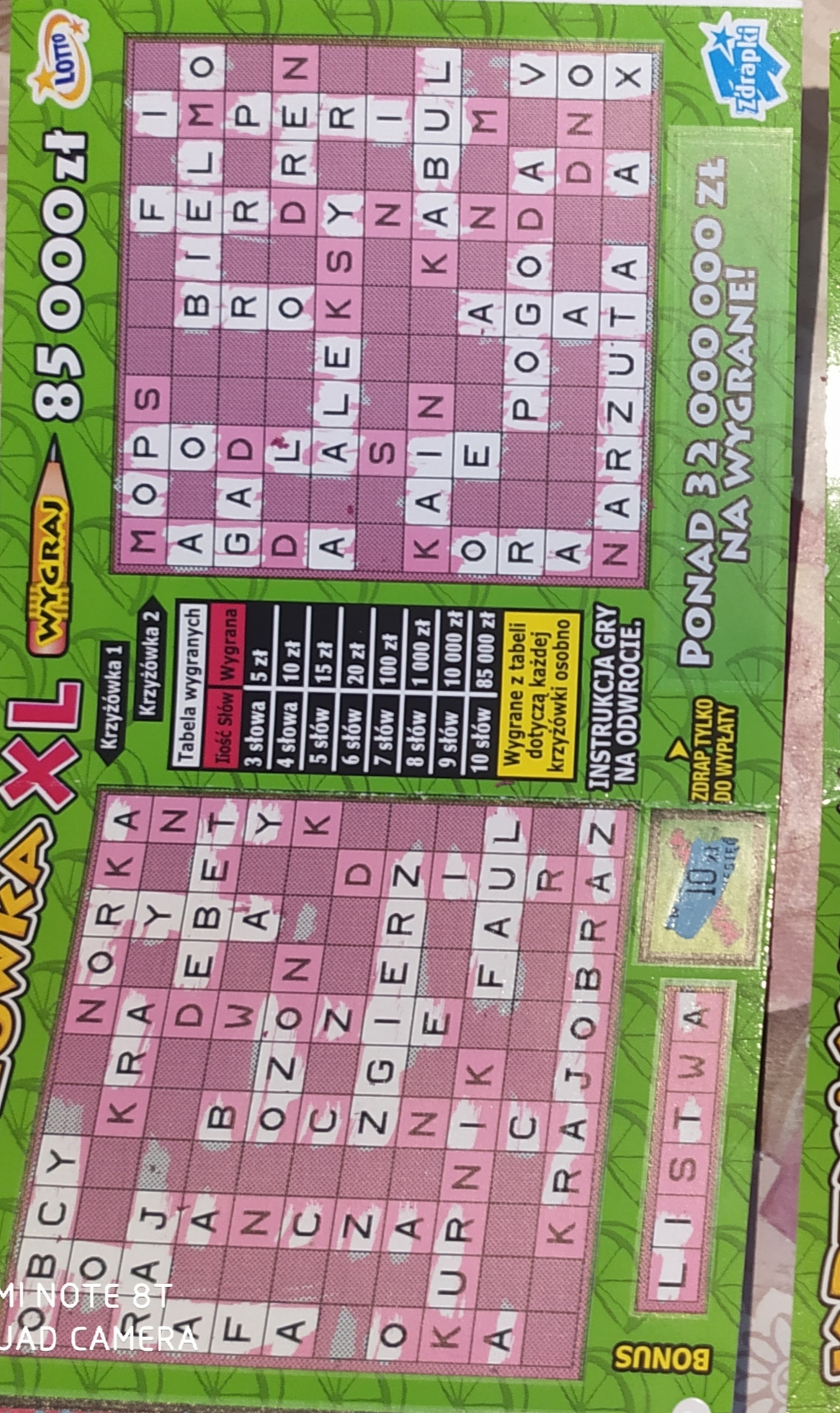 Tyle czasu już minęło i u nikogo nic? U mnie w międzyczasie 20 zł w pomarańczowej a dziś 30 zł w zielonej o nr 10 (6 słów w lewej...po cichu liczyłem na 7