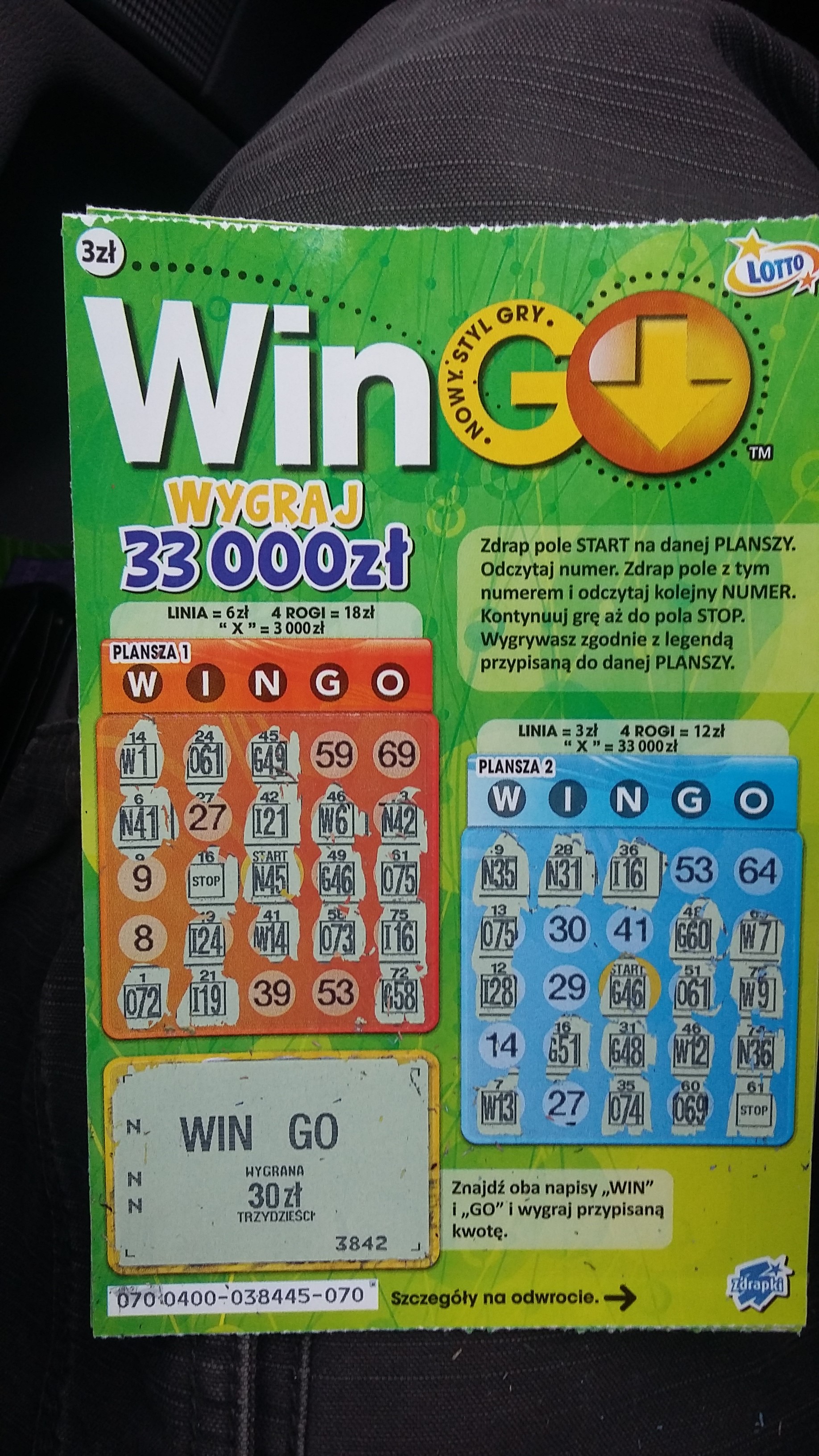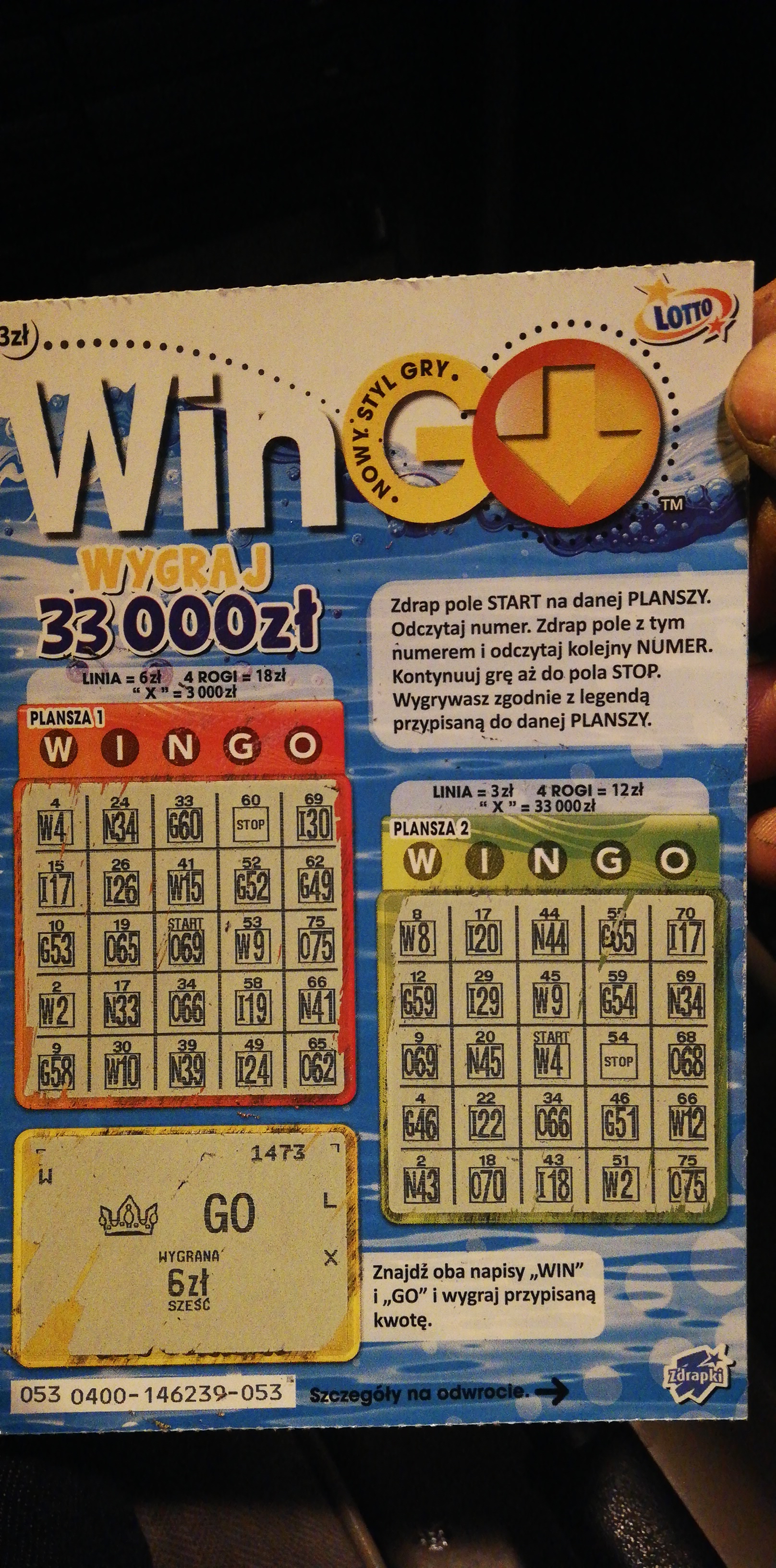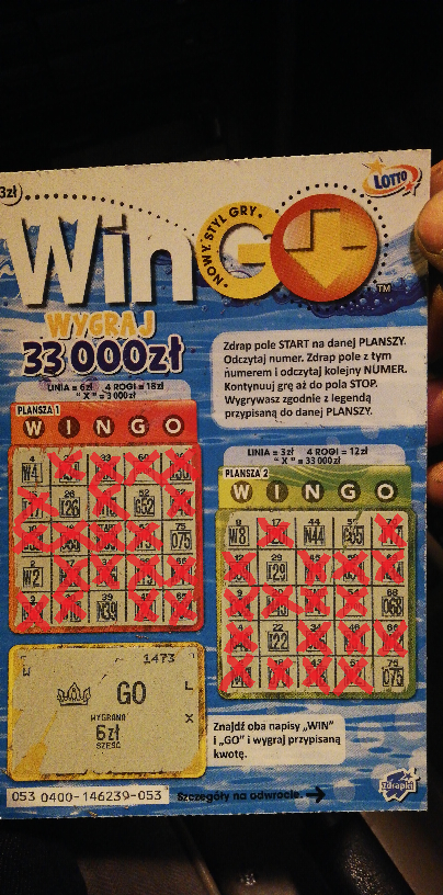 Na przyszłość jakbyś kupował zdrapki: na każdej zdrapce pod warstwą ścieralną masz literki kontrolne, tu w tym WinGo są to WLX a w innej beda inne np. ABC. Trzy różne litery oznaczają w 90% brak wygranej ale nie zawsze. Przeważnie wygrane od 1.000 w zdrapkach mają rożne litery tak jak główna