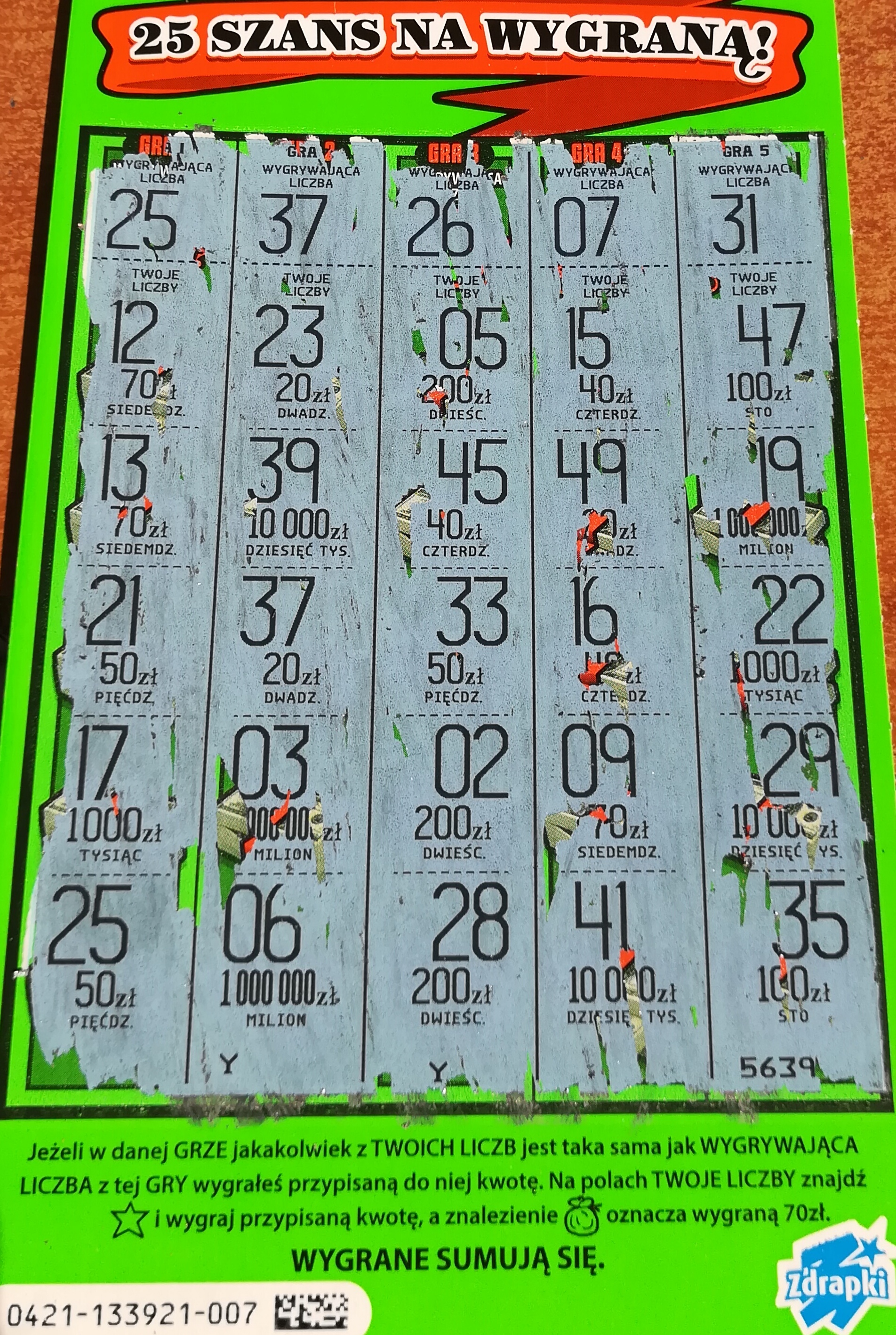 Pomarańczowa, 011, 40 zł, pierwszy raz trafiłem coś więcej niż zwrot w tej zdrapie