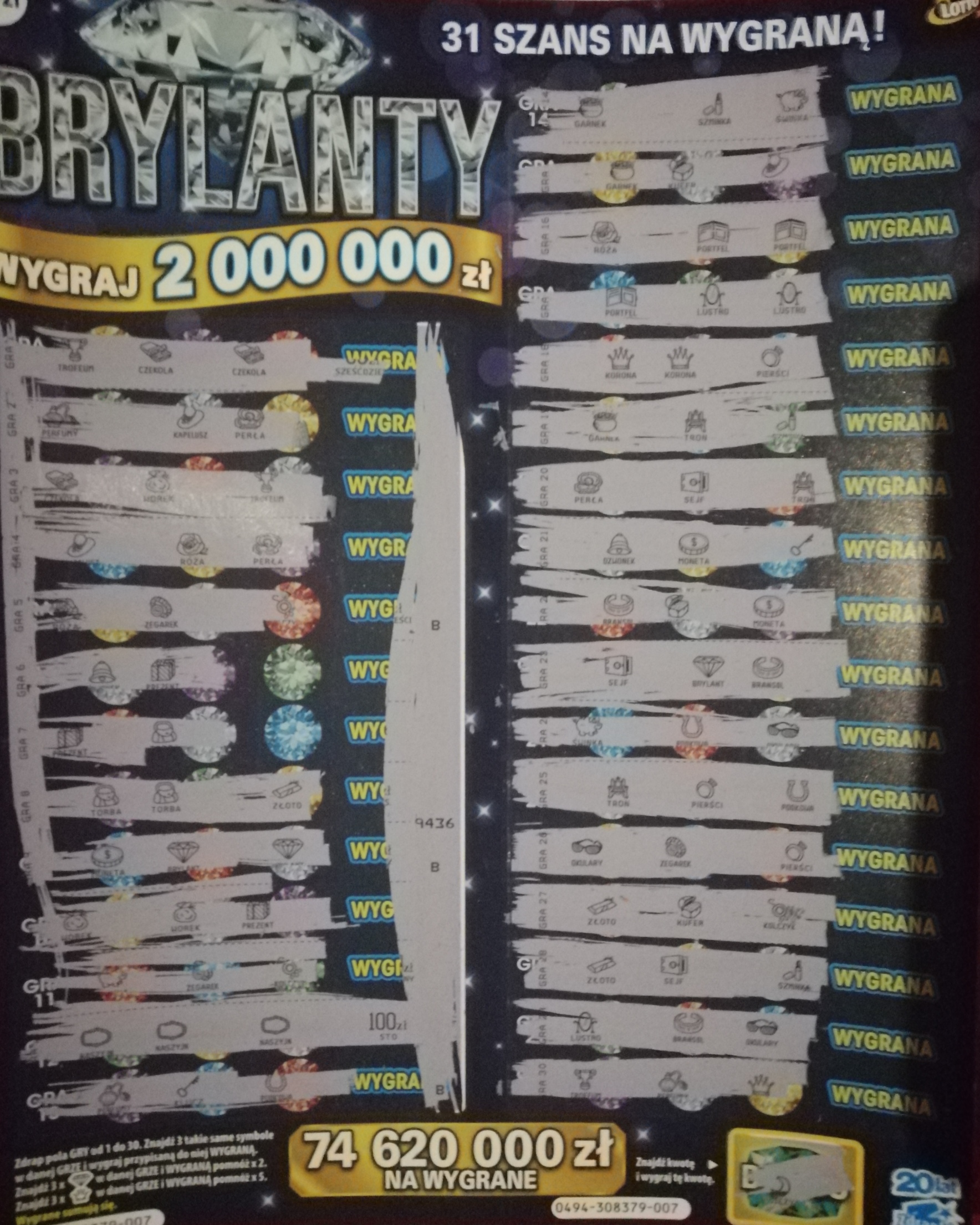 Napiszę wam fajny przypadek jaki mnie spotkał w jednym punkcie.Miałem 30zł na zdrapki i patrzę a na wystawce są brylanty i wydrapane 3xS i numer kontrolny więc poprosiłem.Pan niby nabił bez dzwięku maszyny i dał mi tą sztukę a ja od razu,żeby sprawdził tą zdrapkę.No i stwierdzenie,że pomyliłem się,że przypadkiem wsadziłem itd.Dla mnie to czarowanie dla tych co się nie znają aby jakąś kasę wyrwać.Gościu może coś załapał i próbował ściemę wcisnąć.Ale nie ze mną takie numery Bruner