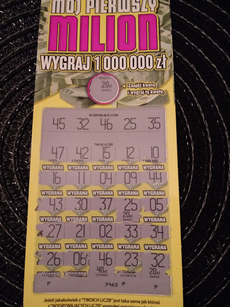 Kilkanaście metrów przed domem znalazłem 10zł więc zafundowałem sobie pierwszą od tygodnia zdrapkę i zdecydowałem się na mój milion (001), oczywiście pustak