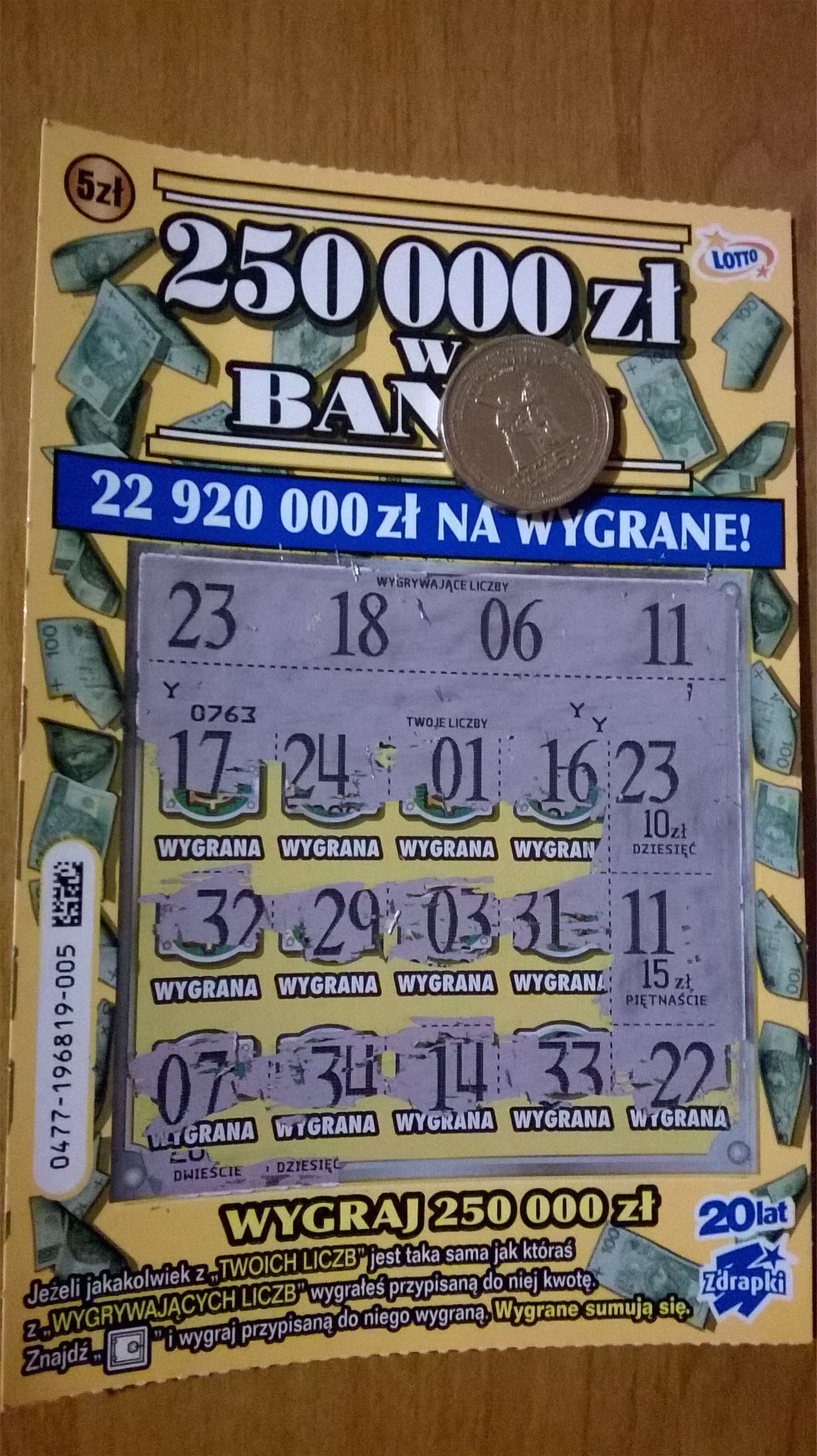 Wziąłem na chybił trafił pierwszą sztukę w tej edycji. Obiecujący początek :) To chyba najszczęśliwsza dla mnie zdrapka za 5 zł. Miałem sporo 25 i na pewno pamiętam też ze trzy 50ki w poprzedniej edycji.