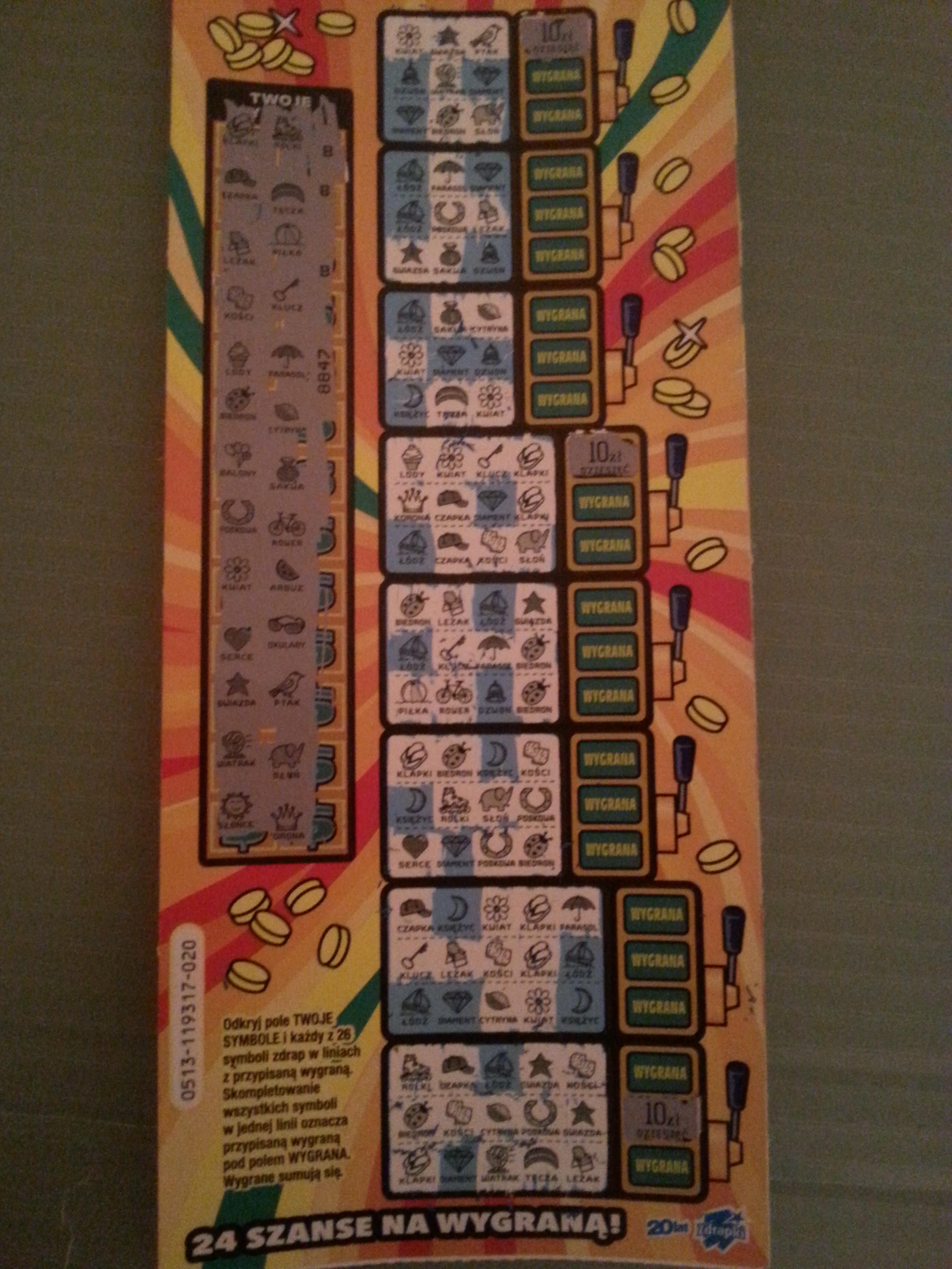 Gratki, 100 zł to już fajna wygrana. Ja z moich wygranych 30 zł wzięłam dzisiaj jedną linię nr 11 i było 20 zł. Fajnie się drapie, a szczególnie jak jeszcze coś wpadnie.