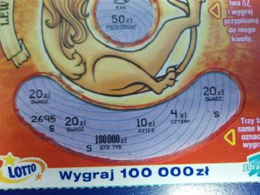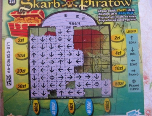 Świetny pomysł na zdrapkę – labirynt. Bardzo często przeze mnie kupowana. Często wpadało 10zł, raz było 20zł. Z tą zdrapką była taka ciekawa sprawa, że raz trafiłem 4zł, ale był jakiś błąd bo dwie drogi utworzone ze strzałek prowadziły do tego stopnia. Zgodnie z zasadami zdrapki wygrane się sumowały i powinienem wygrać 8zł, ale takiej wygranej w tabeli nie było. Wyjaśniałem sprawę w kolekturze, ale mimo to wygrane było 4zł.