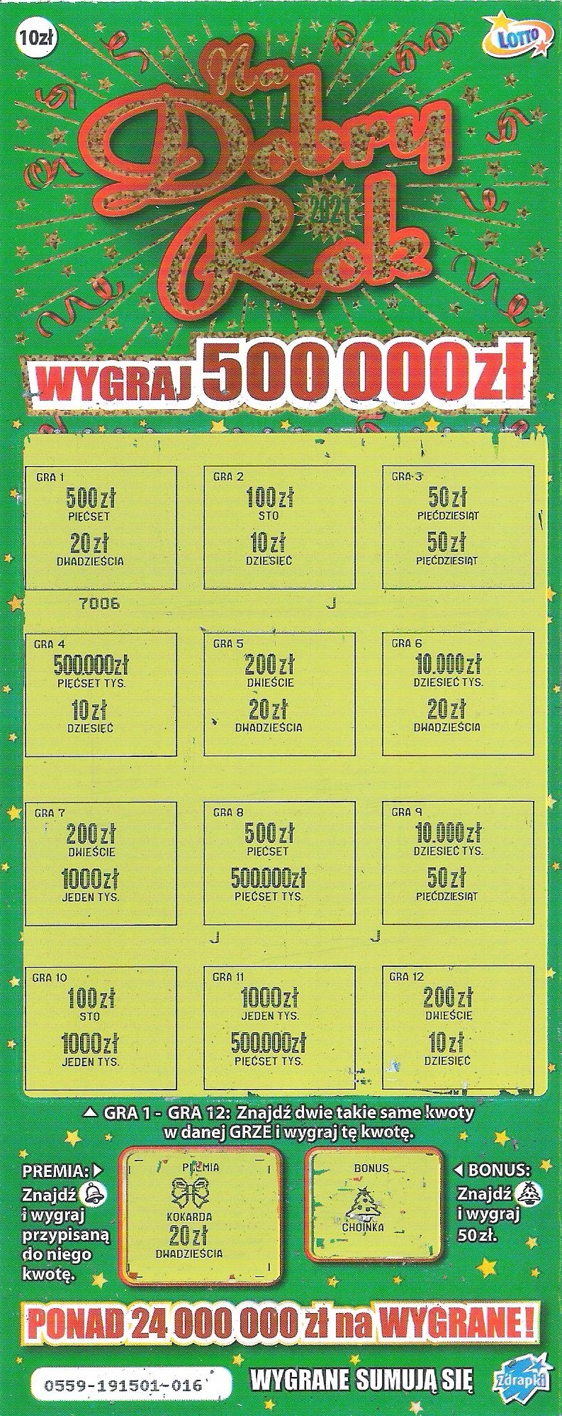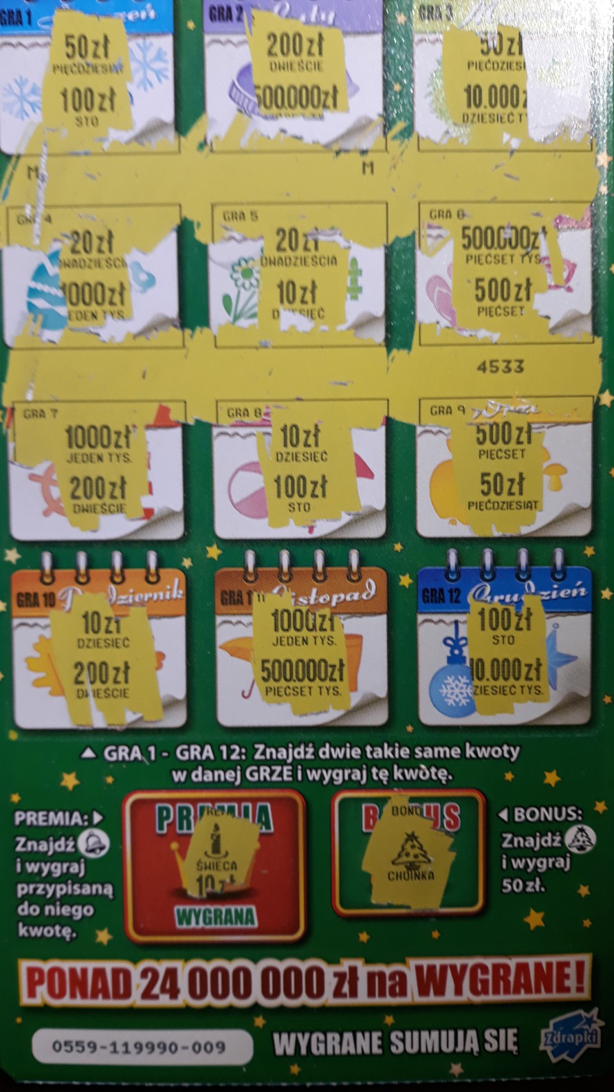 Dzisiaj znowu 1 sztuka, ale tym razem wygrana. I tak zgadza się, po raz 4 wydrapałem choinkę za 50zł, nr 002. Chyba mam podobną serię jak boobs w 500 w dimentach, 50tki idą jedna za drugą