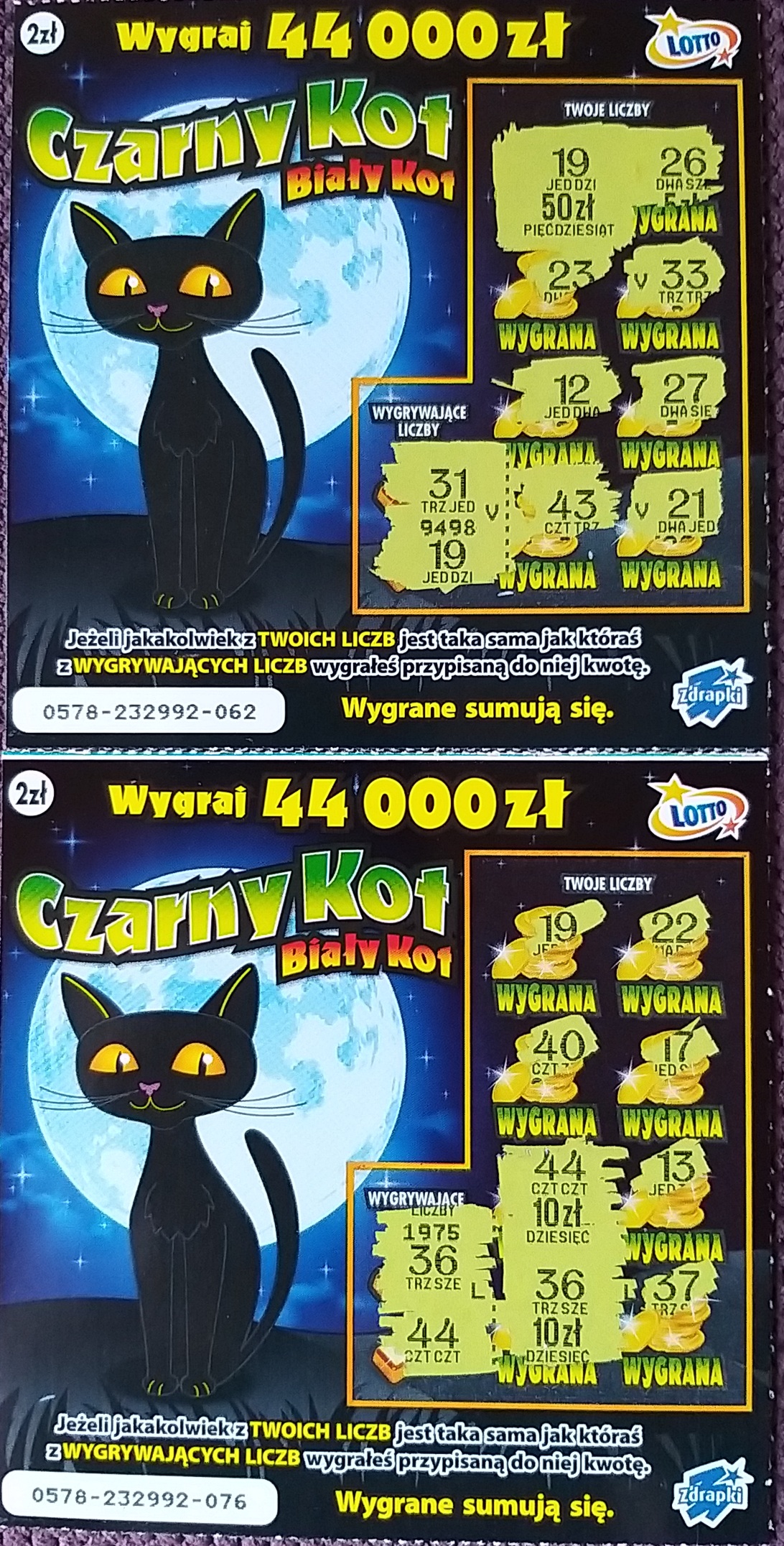 Nie mam pojęcia o co chodzi z tymi Kotami ale kupiłem dziś te 23 sztuki w Lewiatanie bo wczoraj nie miałem już gotówki a tam tylko to przyjmują a z WK kaska była i .... wydrapane 74 zeta