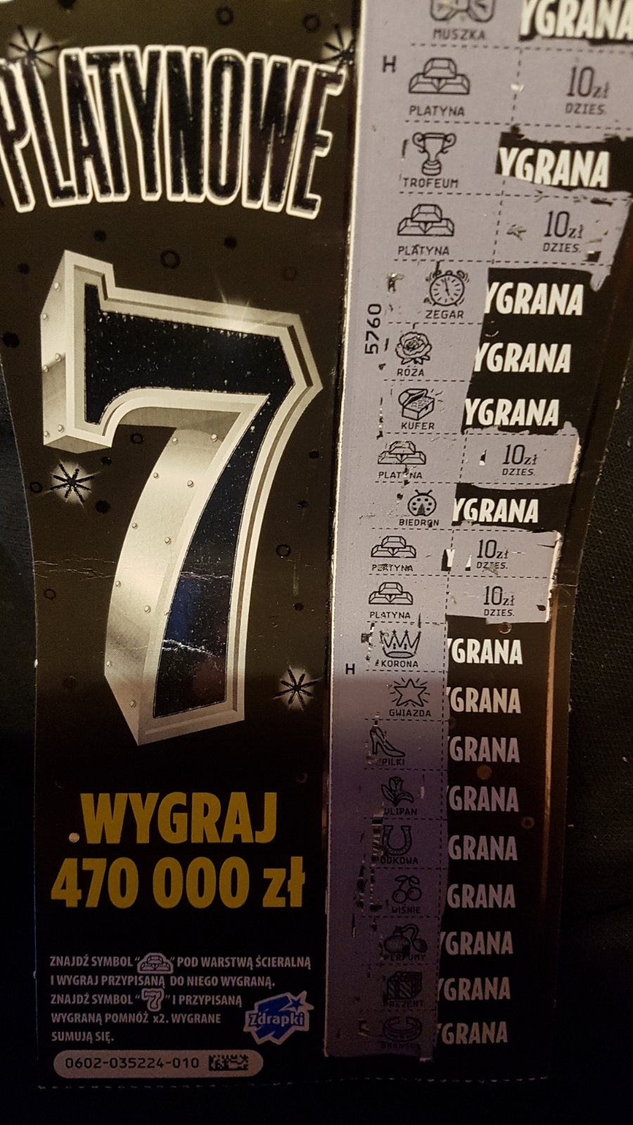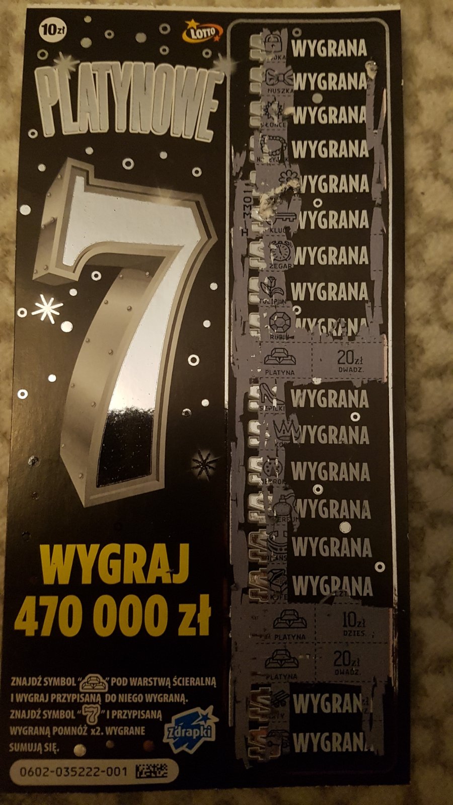 Wymieniłam wygraną zdrapkę i wzięłam platynowe 7, w którym było 50 zł. O ile sobie przypominam to chyba moje pierwsze w tej zdrapce. Dziwne, że tygodniami nic nie wpada ciekawego, a jednego dnia kupione dwie zdrapki i w obydwu fajne wygrane. I to jeszcze w numerach, których nie lubię -1 i 25.