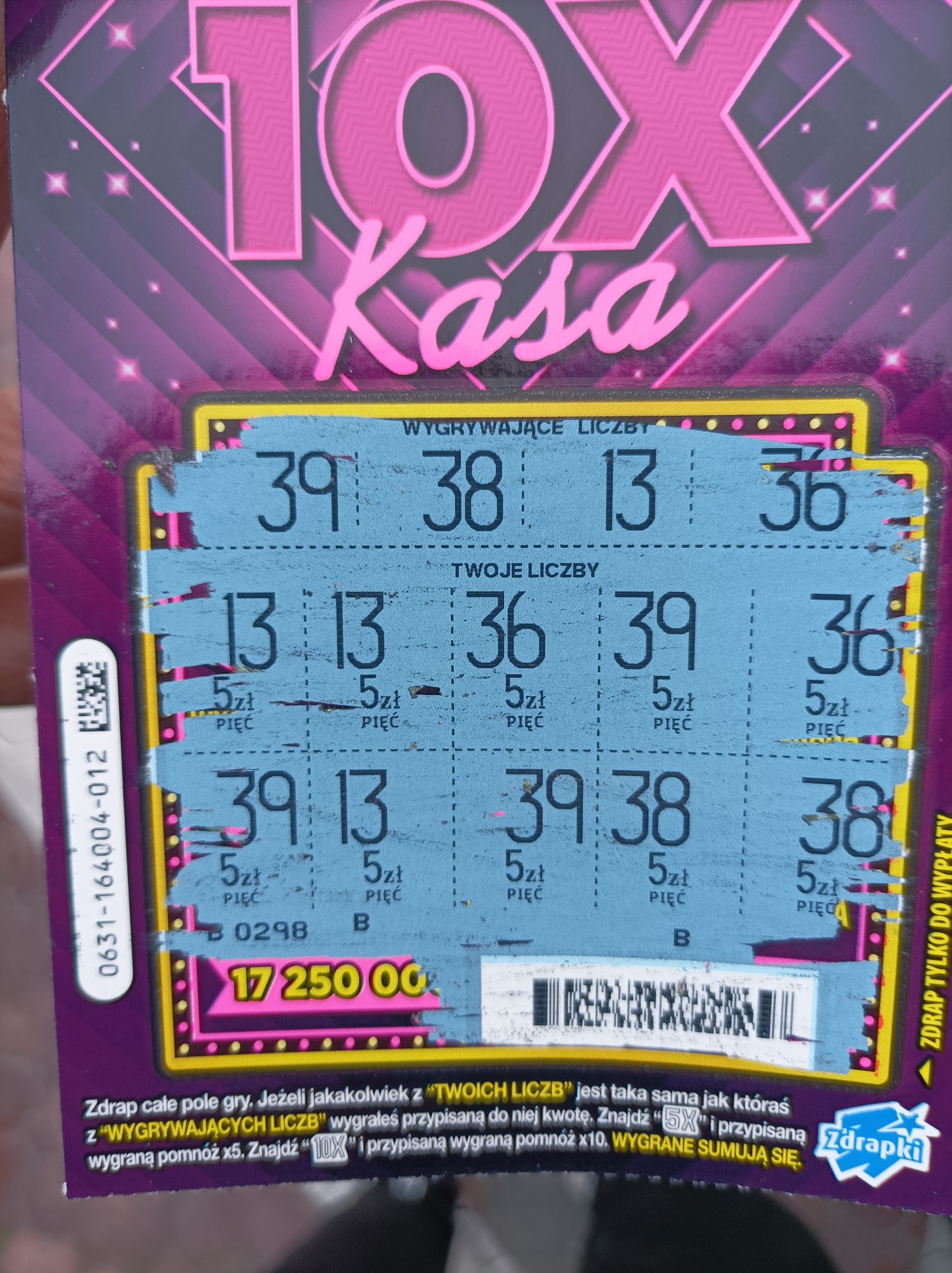 U mnie raczej bez większego problemu z dostępnością tej zdrapki. W większych kolekturach zazwyczaj brak, ale za to w puntach typu monopolowy czy kiosk jest jej miejscami bardzo dużo. Ostatnio nawet na chwilę pojawiła się zielona o numerze 003939, gdzie wszędzie mam tylko fioletową.