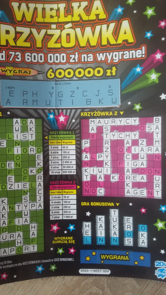 Pewniakiem jest natomiast to ze dzisiaj skuslem się na zakup wielkiej krzyżówki. Moją uwagę przykuł nr 009 i słowa bonusowe. Wydrapałem 4 słowa czyli 100zl i to na razie moja najwyższa wygrana w tej zdrapce