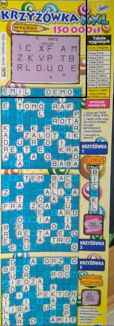 Dziś kolektorka mi podsunęła ją pod nos i niestety wziąłem. Piszę niestety, bo ja z Krzyżówką XXL nigdy się nie zaprzyjaźniłem. Mam za sobą już kilka sztuk różnych edycji i zawsze pustaki. Dziś też oczywiście pustak. Nie mam też za dużo frajdy z jej drapania - 10 zł to dużo i od takiej zdrapki oczekuję jednak minimum frajdy. A w Krzyżówce XXl od razu widać, że jak nie ma określonej literki to 90% słów nie da się ułożyć. Gdzie tu zatem frajda ?