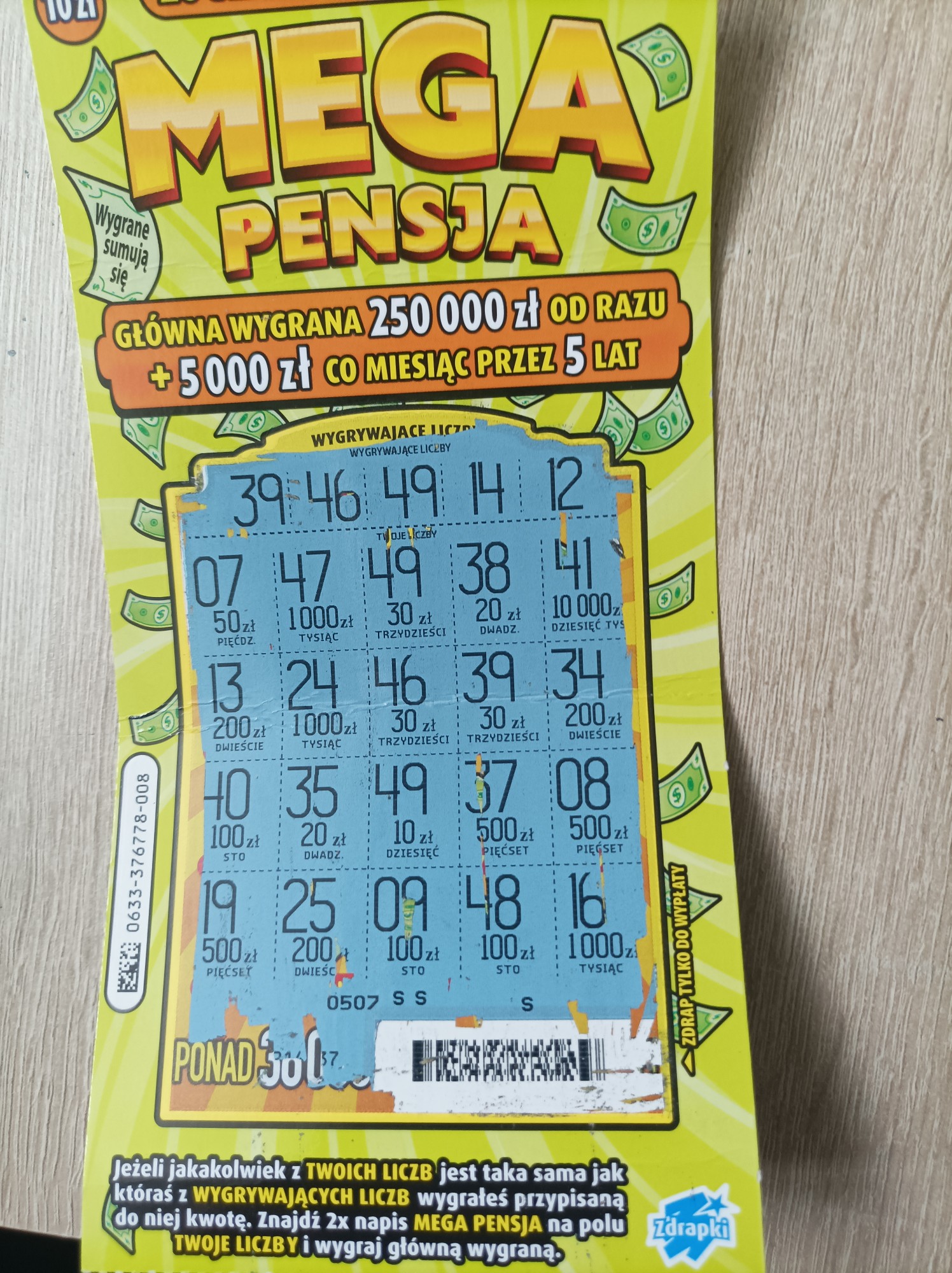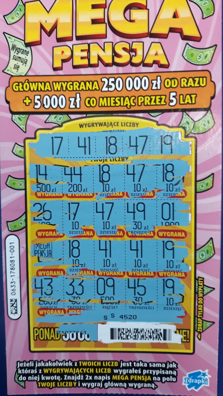 DZiś na Targowej odbierałam wygraną z Lewandowskiego. Kiedy wchodziłam dziewczyna siedziała przy stoliku i drapała zawzięcie Mega Pensje. Chyba miała ich kilkanaście rozłożoinych na blacie. Siedziała na krzesełku i elegancko wydrapywała cyferki a nie tylko kod i bach pod maszynę do sprawdzenia. Kiedy odebrałam w specjalnej kasie swoją wygraną i wychodziłam , ta dziewczyna stała przy kolektorce i sprawdzała co wydrapała i miała jakiś kupon Keno. W każdym razie wzięła z pudełka 8 mega Pensji i dostała zwrot 14 zł. W pudle ze zdrapkami została jedna Mega to ją wzięłam i było 100 zł. Jak mozna zostawić jedną zdrapkę z całej prawie drapanej paczki i odebrać 14 zł. Nie wiem. Ja bym tak nie zrobiła.