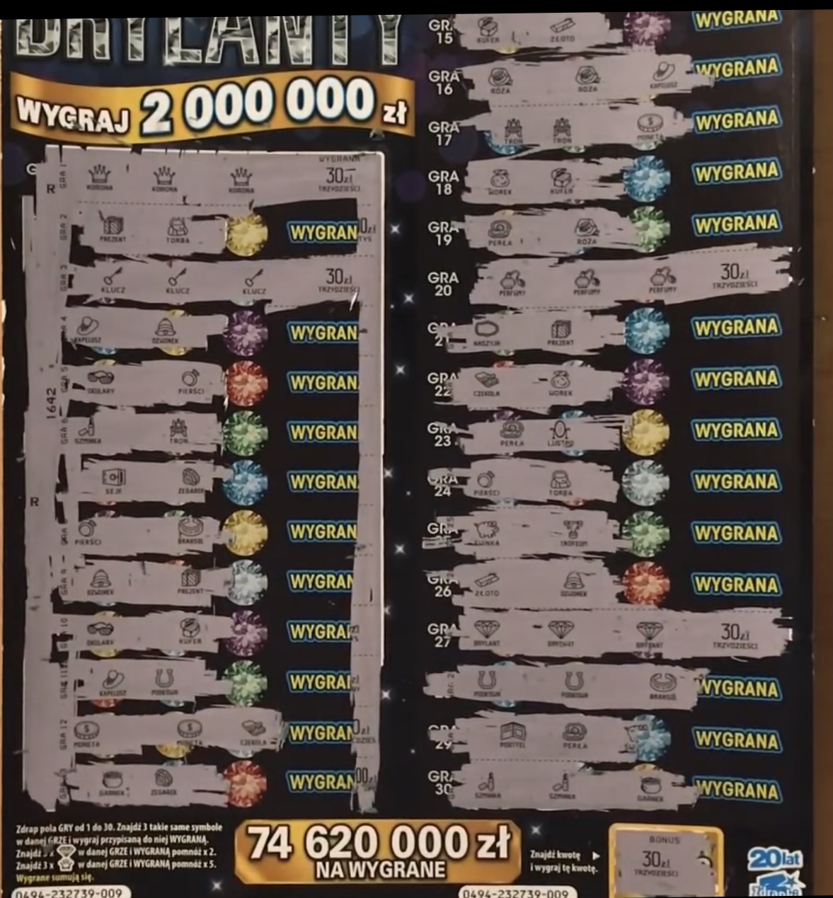 Tak jak obiecałam wrzucam zdjęcie najlepszej do tej pory mojej zdrapki Brylanty z końca 2019 roku, wydrapane: 300 zł i wszystko co możliwe na tej zdrapce (korony, brylanty, potrójne symbole i bonus