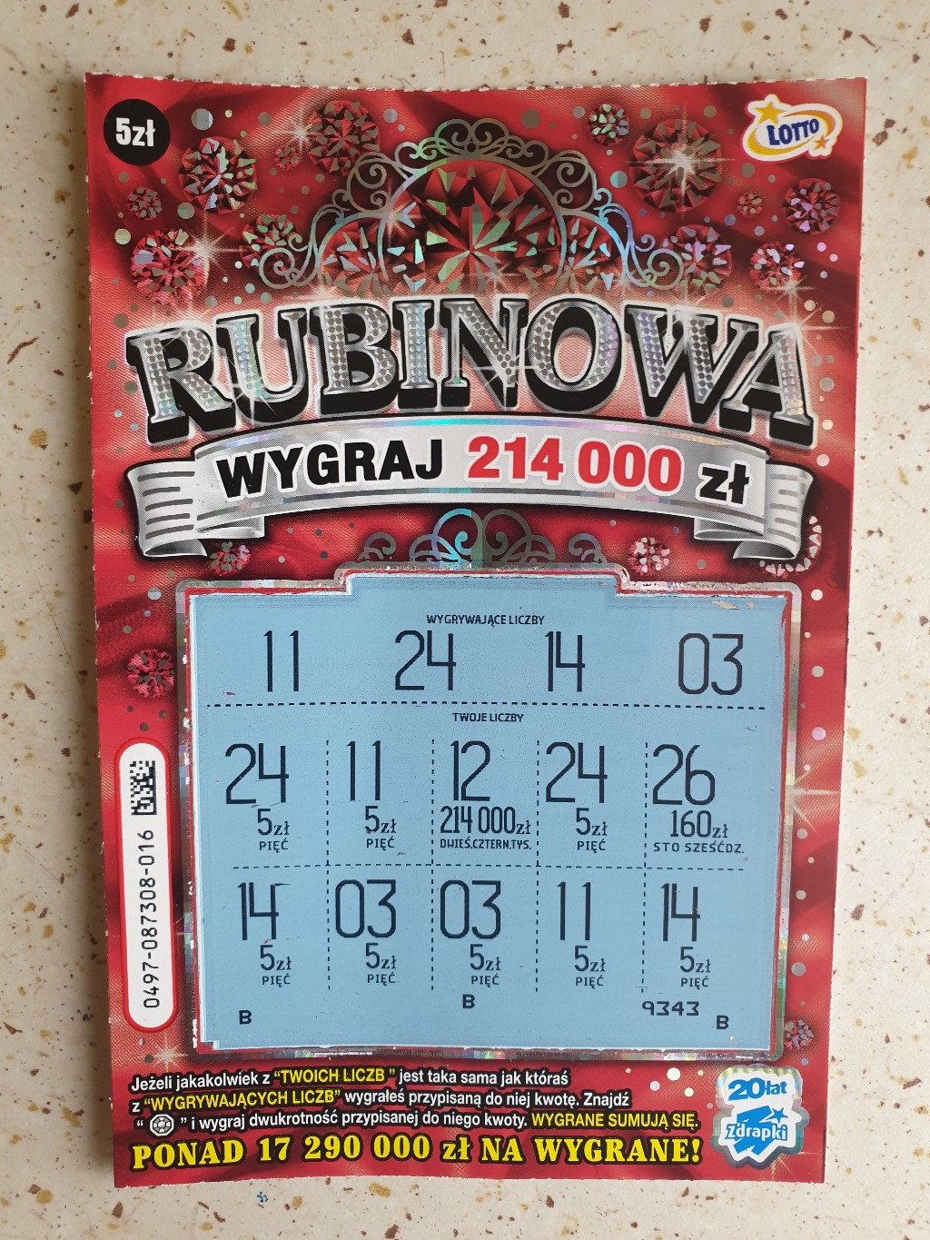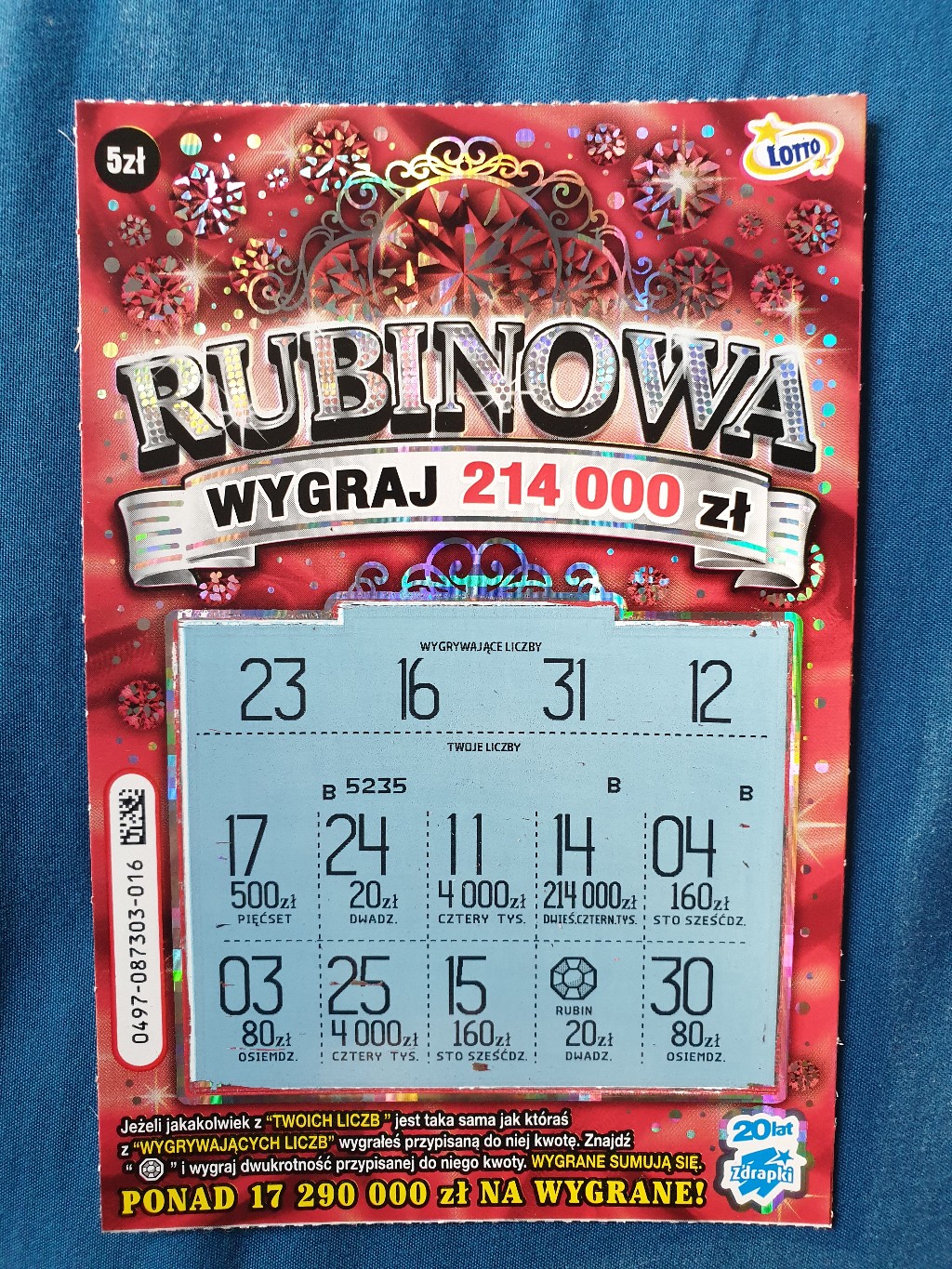 Dziś kupione kolejne 3 sztuki i wpadło 5 zł w postaci rubina, czyli dyszka. PS. gdzie wcięło wszystkie wygrane po 4 tys. zł na stronie lotto.pl ?