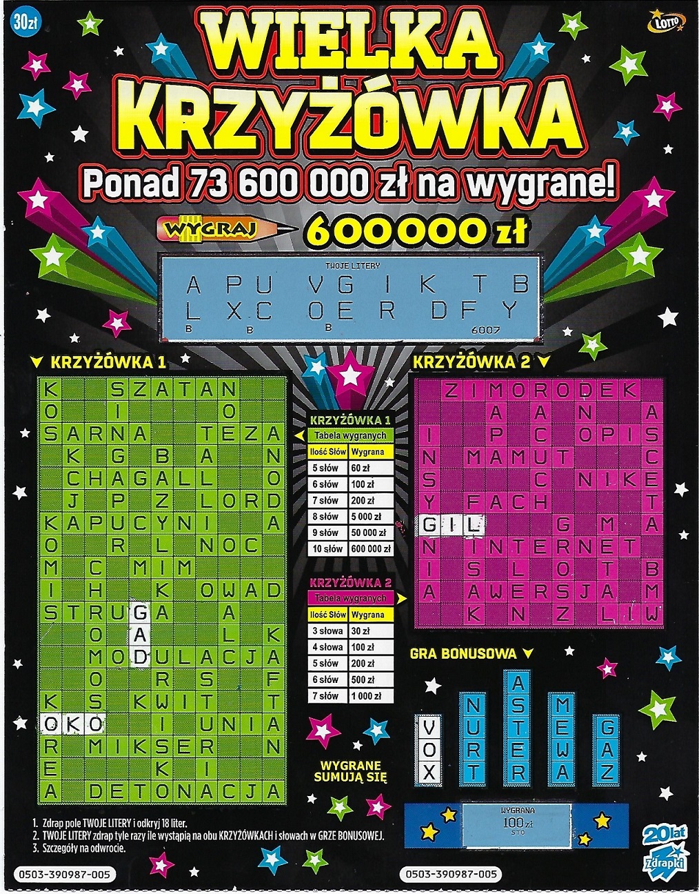 U mnie dziś jedna sztuka 001 i 60zł (5 słów w 1 krzyżówce)