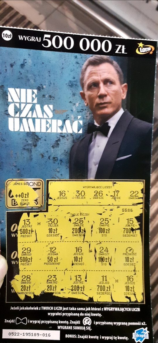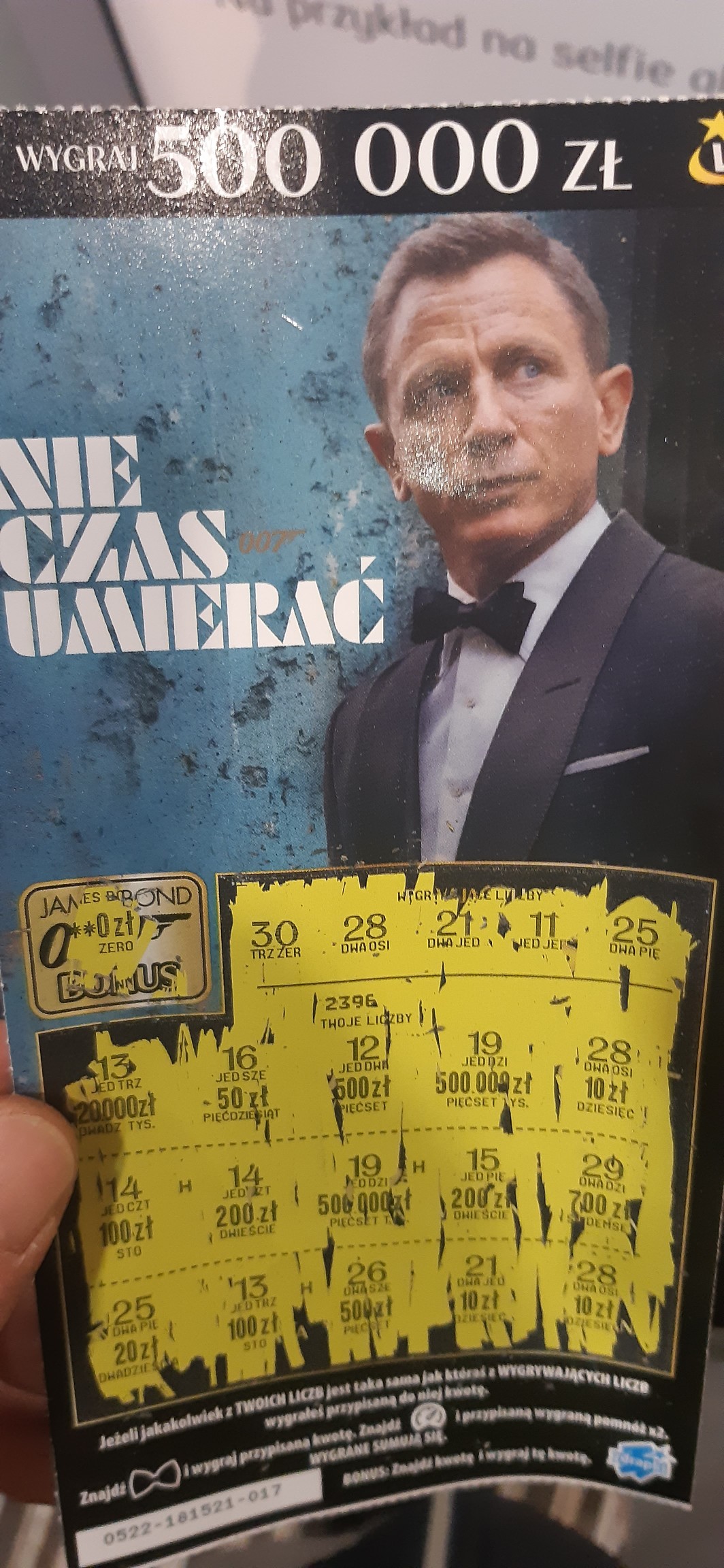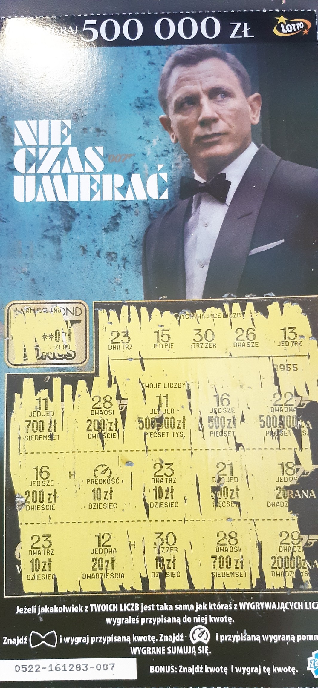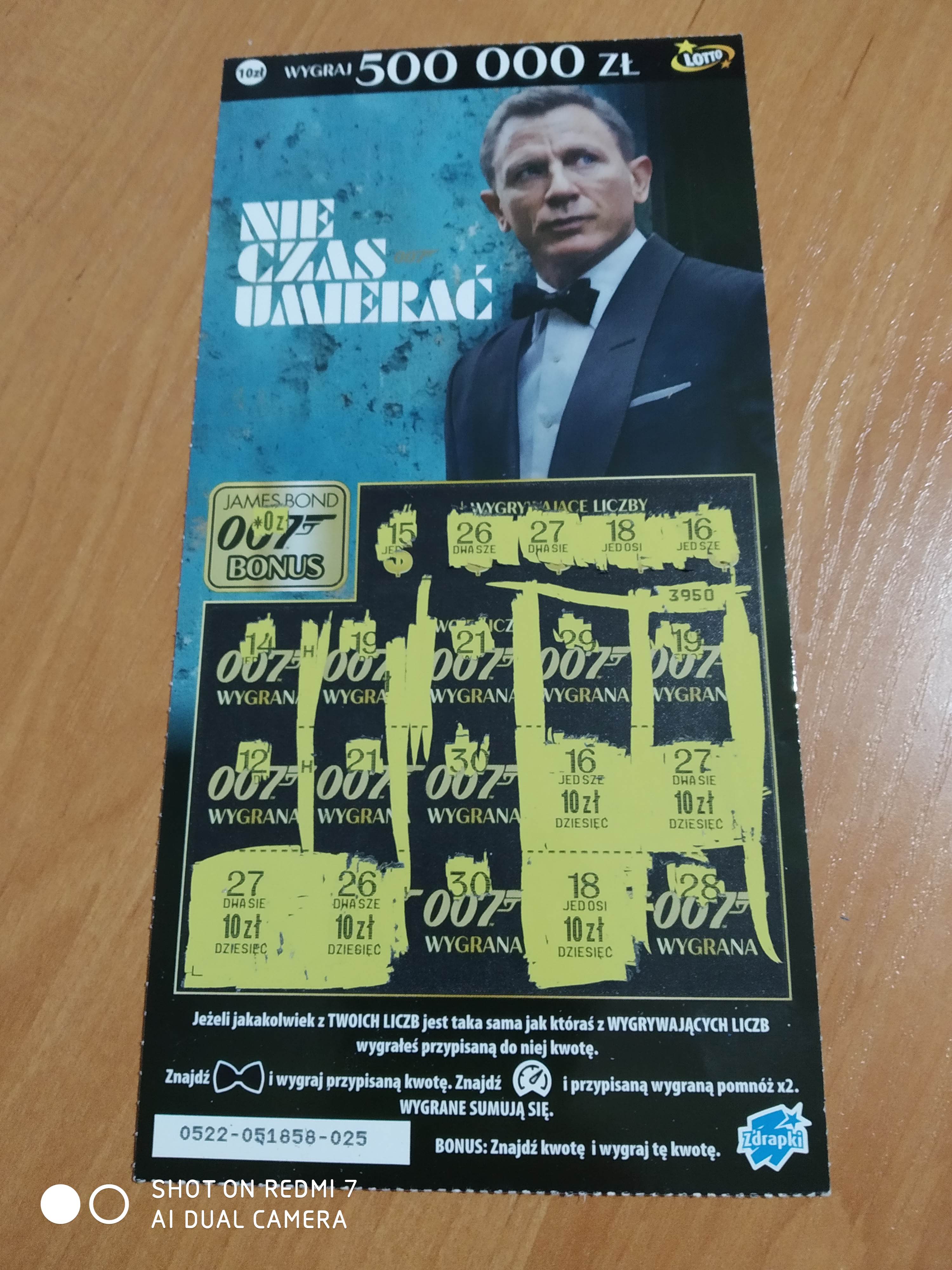 Ekstra wygrana i to jeszcze w 007. Ja tej zdrapki nie kupuję. Nie przepadam za nią, bo na kilka zdrapanych sztuk wpadł chyba ledwie zwrot.