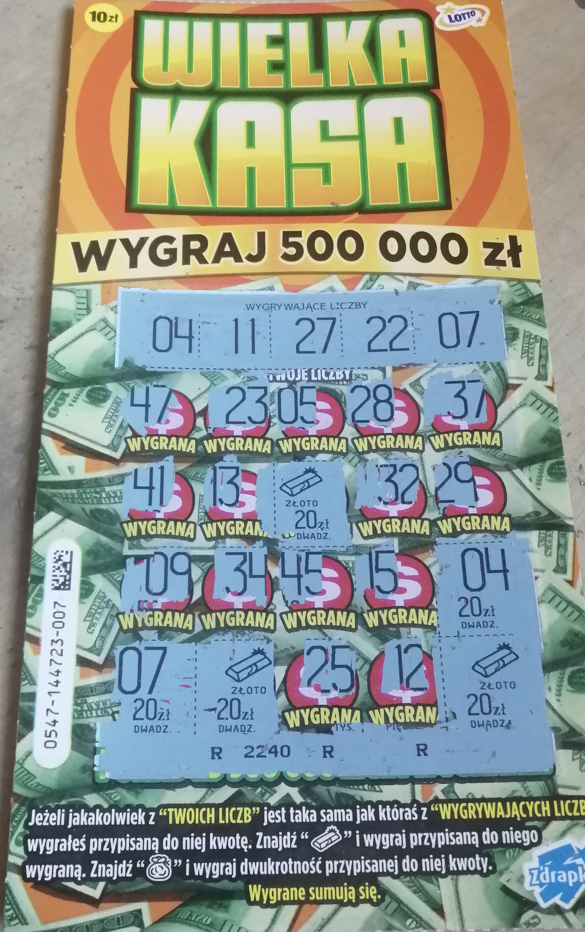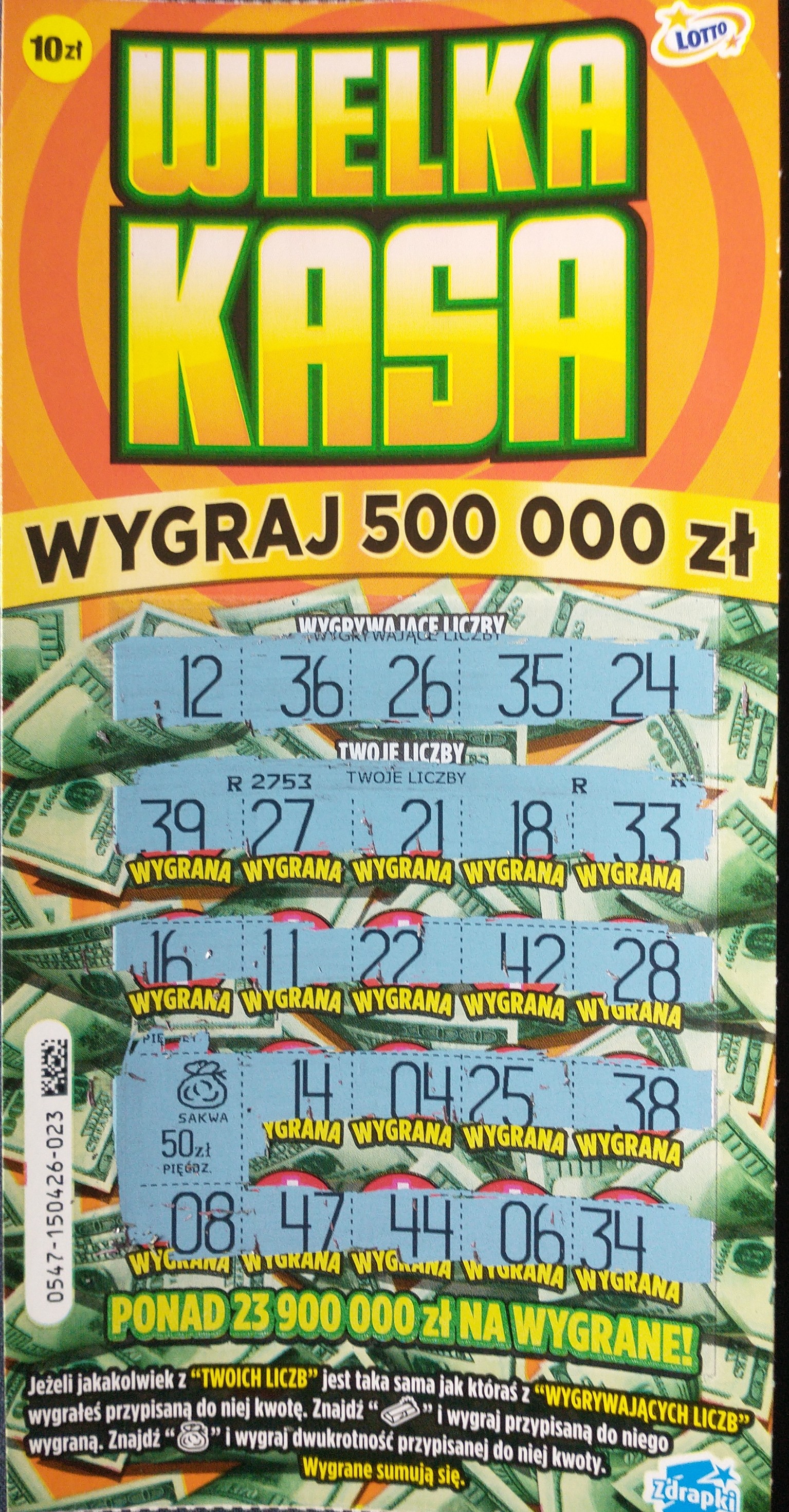 Dziś kupując Wielką Kasę i 500 tyś w banku Pani otwierała nowe paczki i pytała jaki numerek więc wzięłam 23 w jednej i drugiej. 500 tyś puste a w Wielkiej Kasie 100 zł