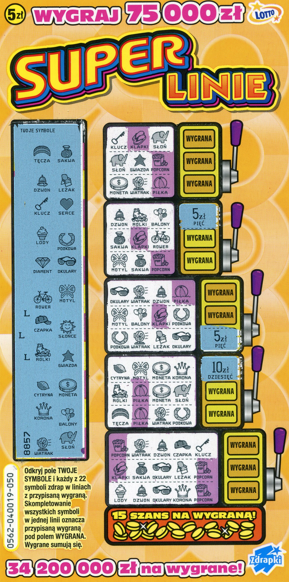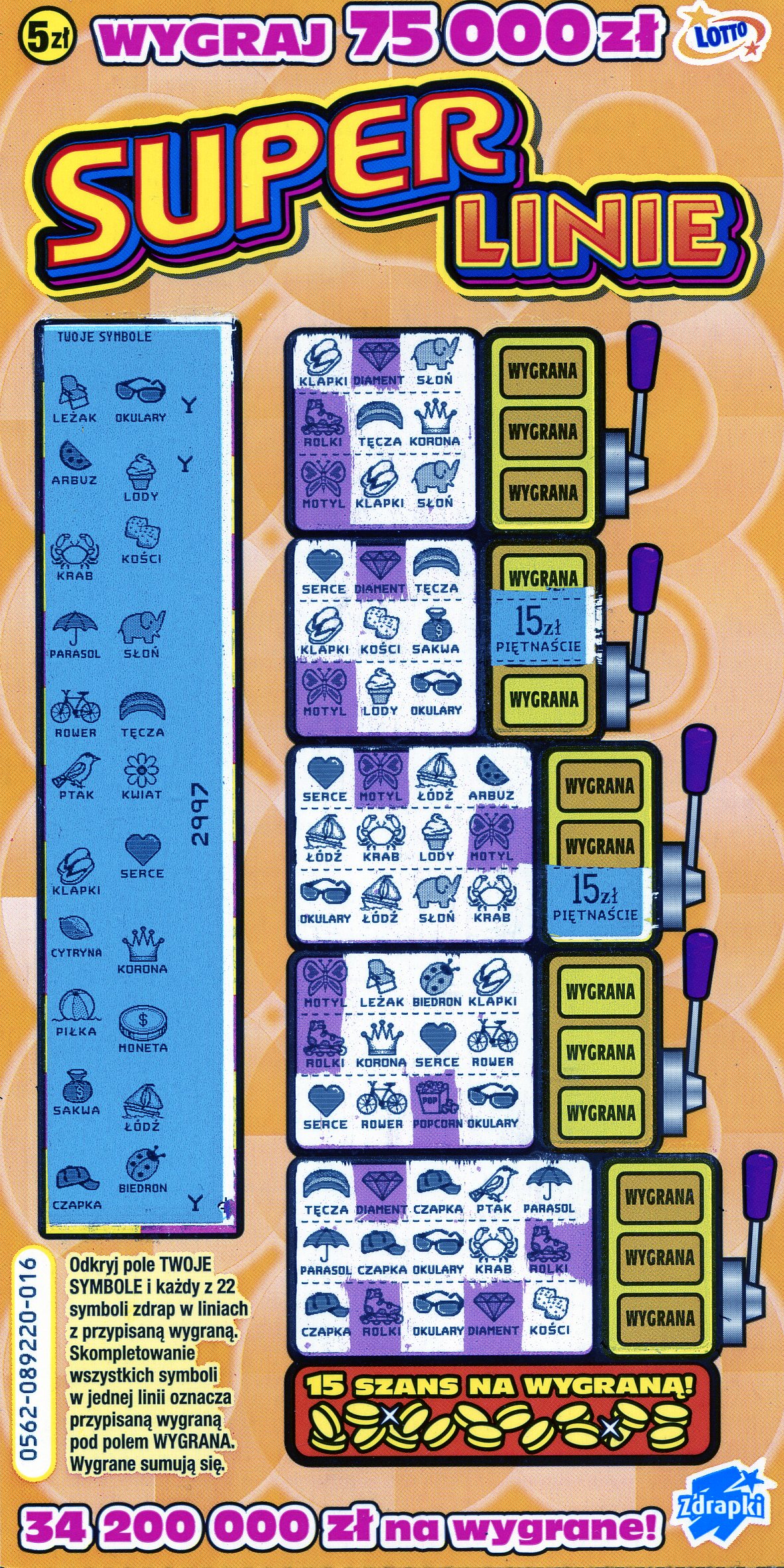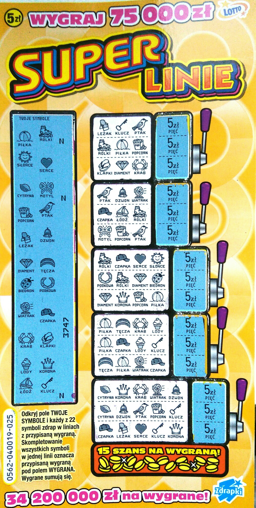 Normalnie to bym tych Super Linii nie wziął bo nie lubię i jeszcze przedział spalony, ale zdrapkę wybrała wyjątkowo kolektorka. Normalnie to jestem w szoku bo nie sądziłem że kiedykolwiek uda mi się w niej coś sensownego wydrapać. Ni z tego, ni z owego wleciało takie oto 75 złotych