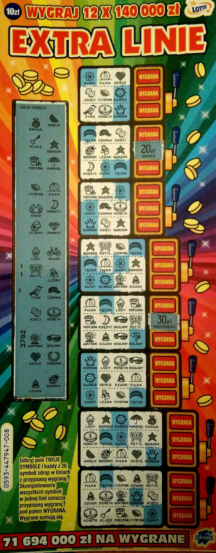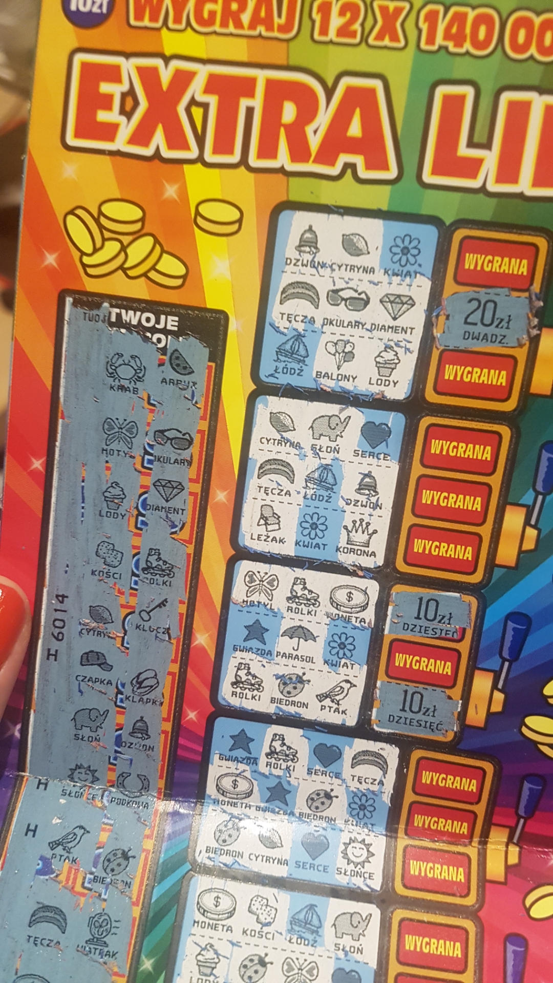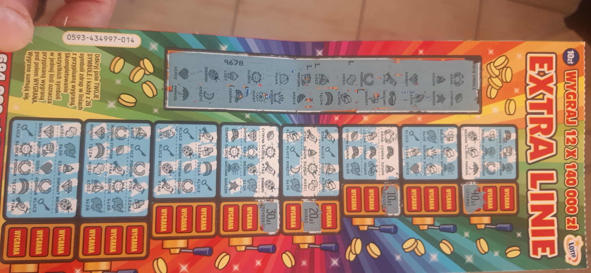 Miałem nr 9,ale dziwna zdrapka. Tylko dwa symbole spalone i to na samym końcu, ale tylko jedna linia. Myślałem że wreszcie trafi się cała zdrapka wygrana, ale niestety. Było 20 zł. Jak na fb widzę że po 2 symbole spalone to mają 500 lub 1000